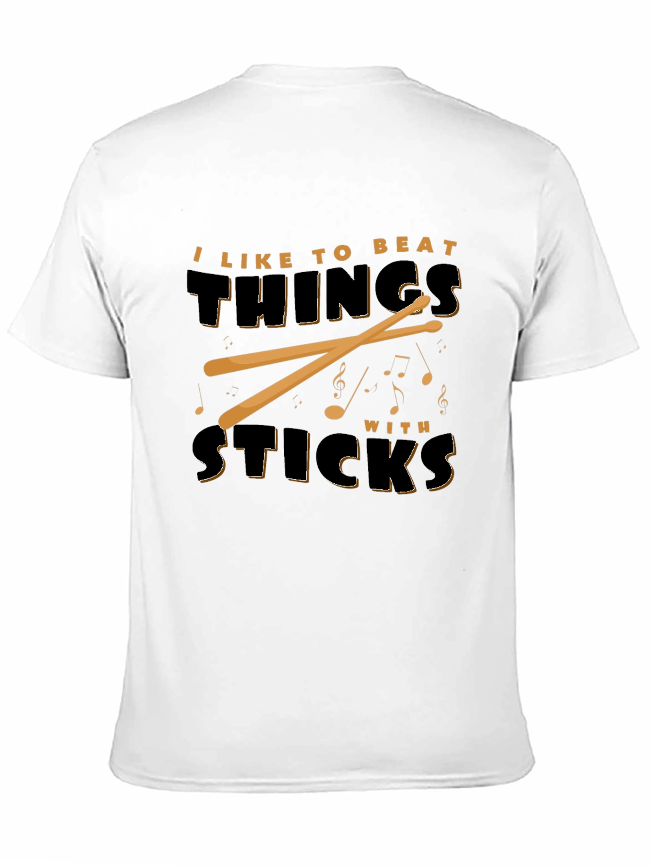 Express your playful side with this black tee featuring a humorous graphic! This T-shirt showcases the phrase "I LIKE TO BEAT THINGS WITH STICKS" in a bold, shadowed font. Crossed drumsticks and musical notes accent the statement. Constructed from what appears to be a comfortable and durable cotton blend, this tee offers a relaxed fit perfect for everyday wear. Ideal for musicians, percussionists, or anyone with a quirky sense of humor, this shirt is sure to spark conversations and showcase your unique personality. Wear it casually, at band practice, or to your next gig and let everyone know you've got rhythm!