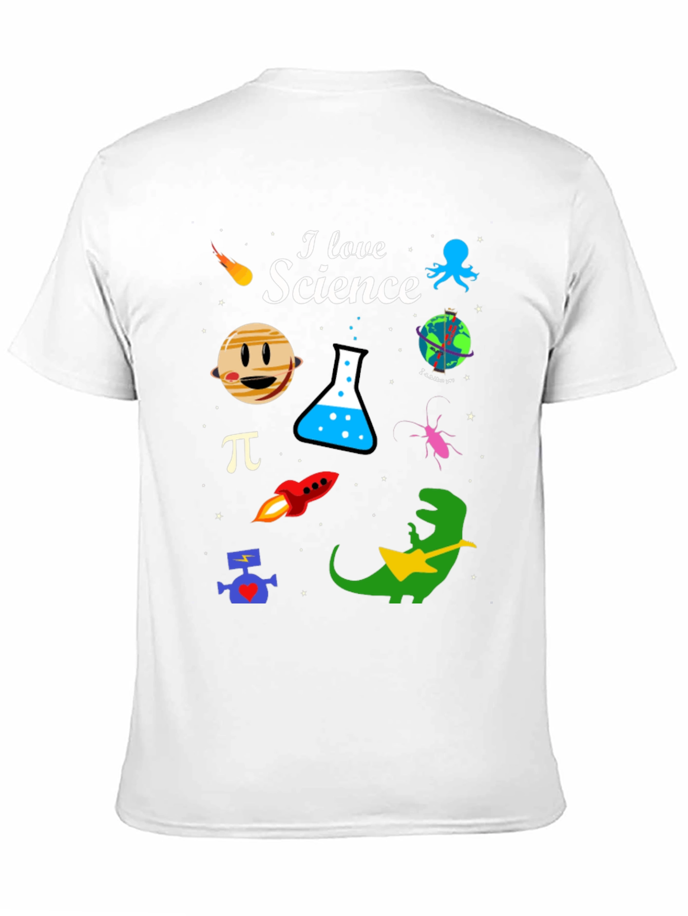 Show off your passion for science with this eye-catching black t-shirt! Featuring a playful design, this shirt displays various science-related images, including planets, a beaker, a dinosaur playing guitar, and the text "I love Science." The colorful graphics are printed on a soft, comfortable fabric. Perfect for science enthusiasts, students, teachers, or anyone who appreciates a fun and unique design, this t-shirt is a great way to express your interests and make a statement. Wear it to school, science club, casual outings, or simply while relaxing at home. Get ready to spark conversations and spread your love for science with this cool tee!