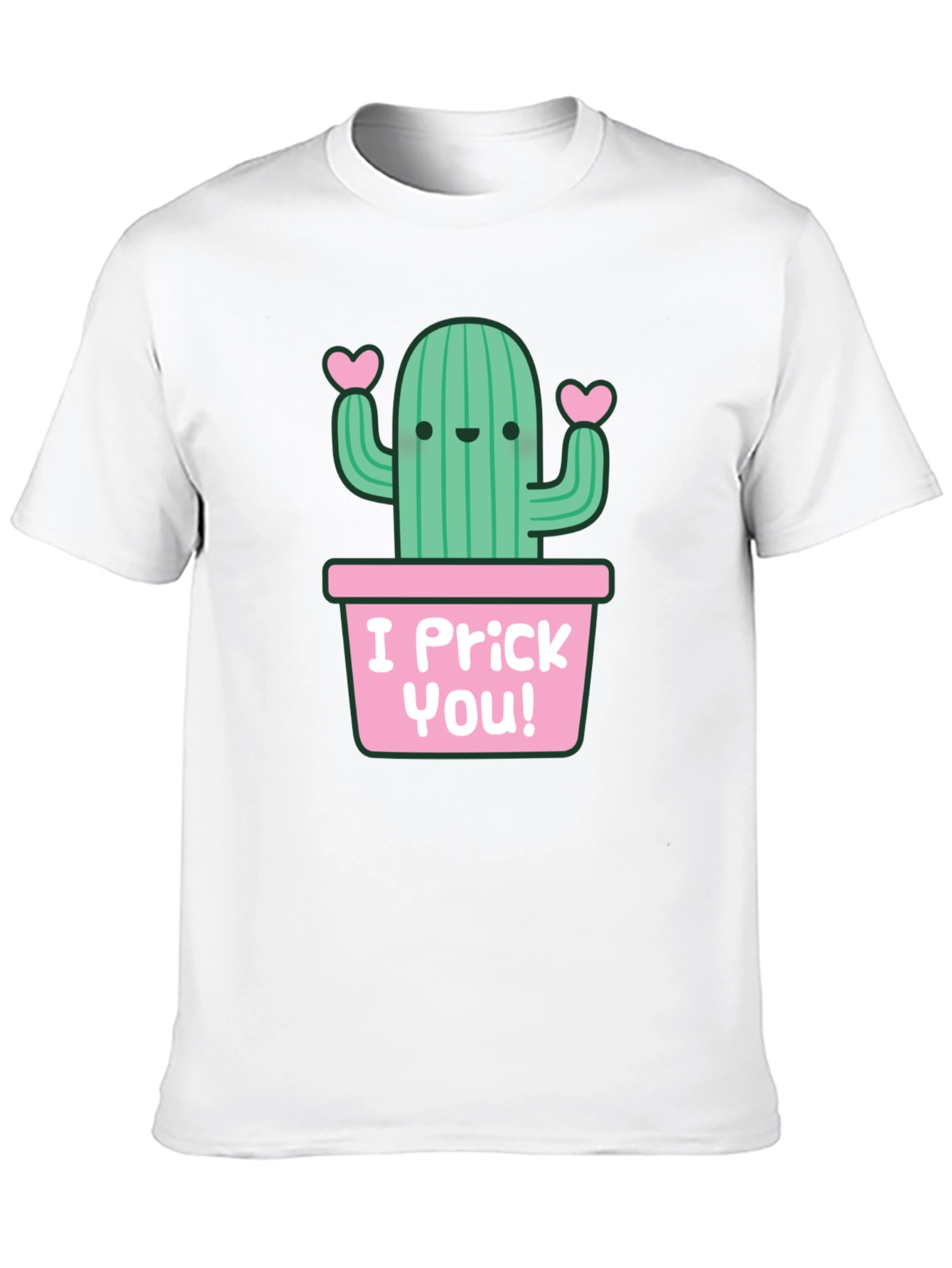 Show off your quirky sense of humor with this eye-catching graphic t-shirt. The black tee features a cartoon cactus design in a cute pink pot, complete with heart accents and the punny phrase "I Prick You!". Made from a comfortable, breathable fabric, this shirt is perfect for casual wear. Stand out from the crowd and spread some smiles with this unique and playful t-shirt. Ideal for everyday wear, lounging at home, or as a fun gift for a friend. Pair it with jeans, shorts, or leggings for a stylish and comfortable look. A must-have addition to any wardrobe!