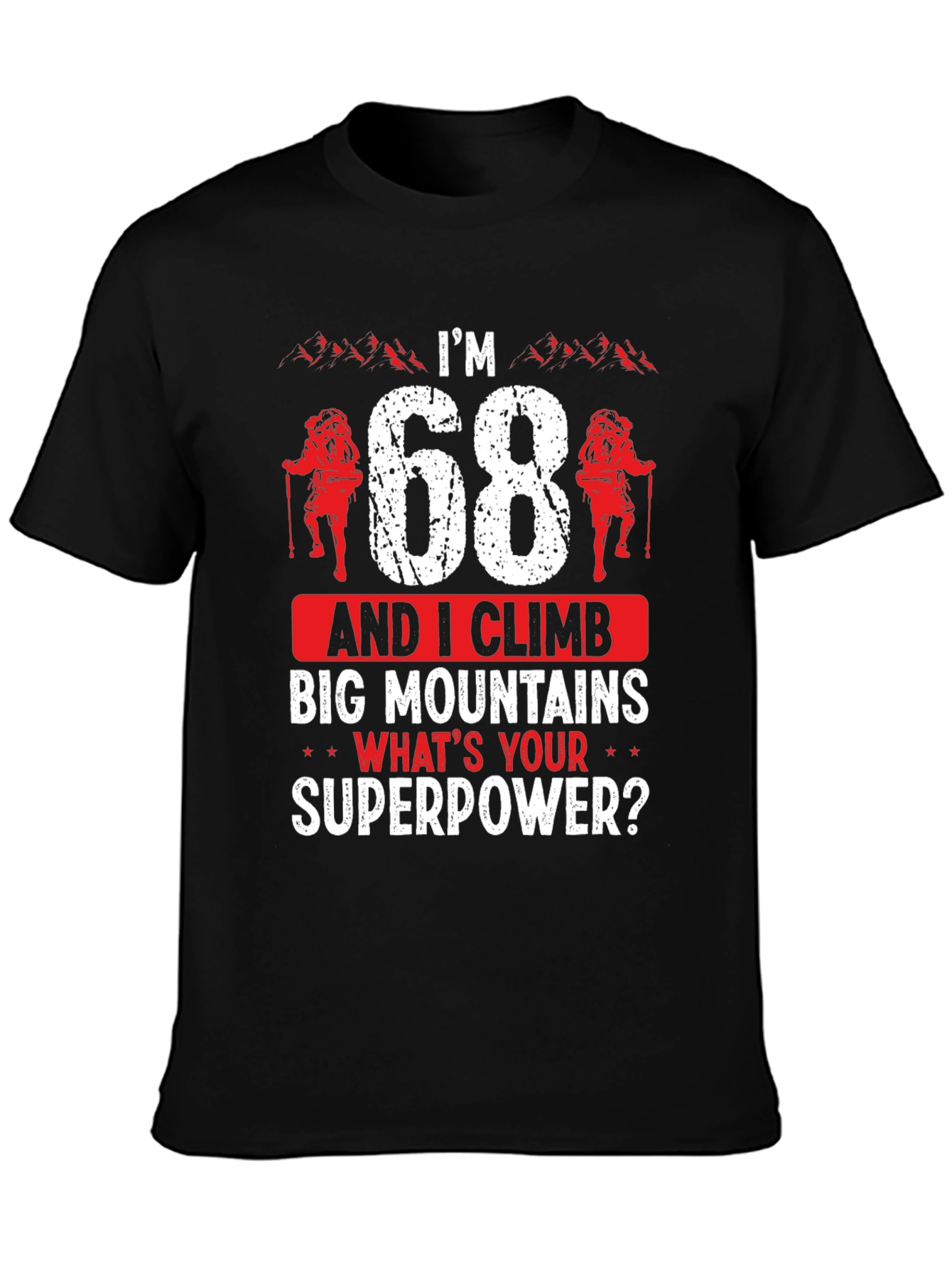 Show off your adventurous spirit with this unique novelty t-shirt. This black tee features a bold graphic print that reads "I'm 68 AND I CLIMB BIG MOUNTAINS WHAT'S YOUR SUPERPOWER?" The design incorporates climber silhouette accents and mountain graphics. Made from a soft and comfortable fabric, it's perfect for everyday wear or your next hiking trip. A great conversation starter and a fun way to express your love for the outdoors. Ideal for anyone who loves hiking, climbing, or simply enjoys a good laugh.