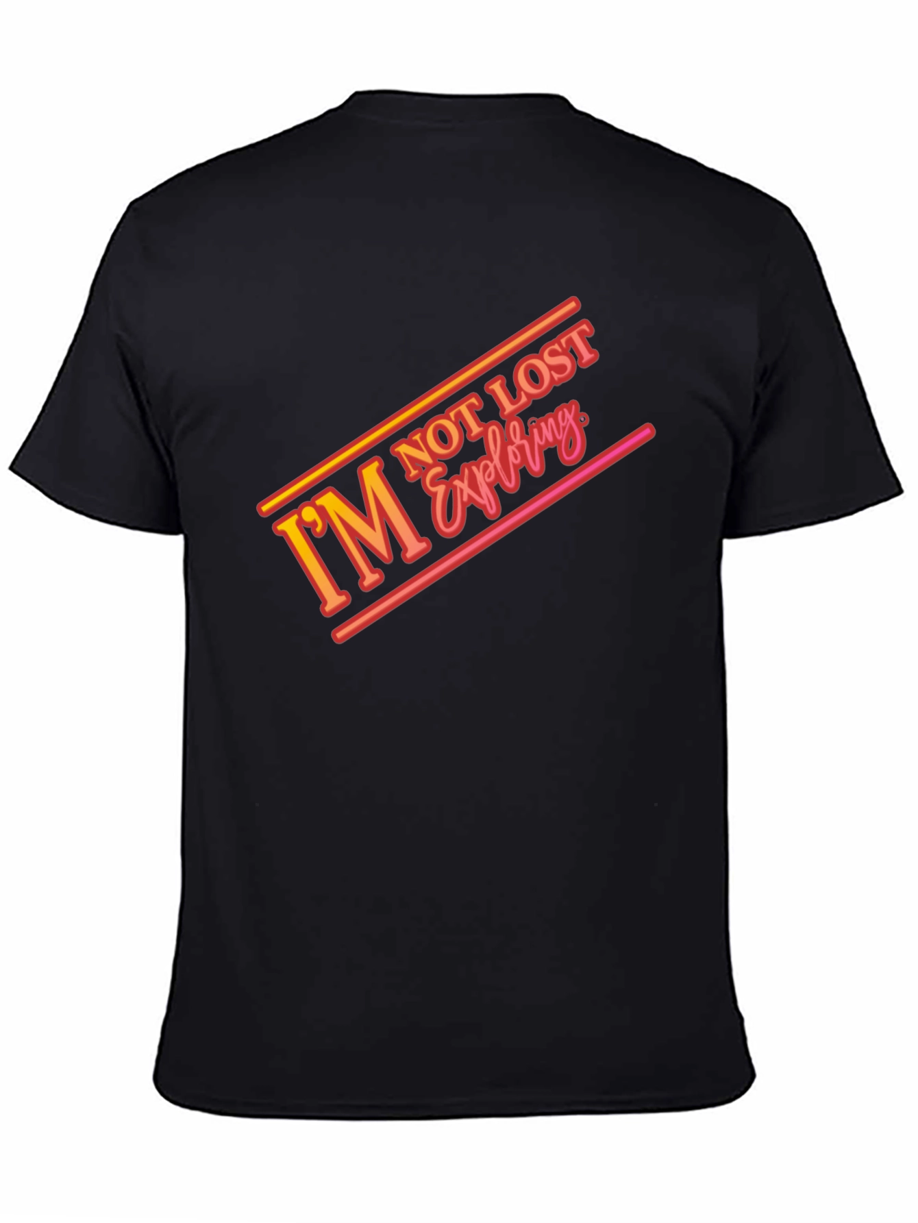 Embrace your adventurous spirit with this stylish black t-shirt. Featuring a bold, eye-catching graphic that reads "I'm Not Lost Exploring" in a retro neon font, this tee is perfect for anyone who loves to explore and wander. The design adds a vibrant pop of color to the classic black backdrop. Made from comfortable, breathable fabric, this shirt is ideal for everyday wear, whether you're hitting the trails or simply hanging out with friends. Show off your love for exploration with this must-have tee!