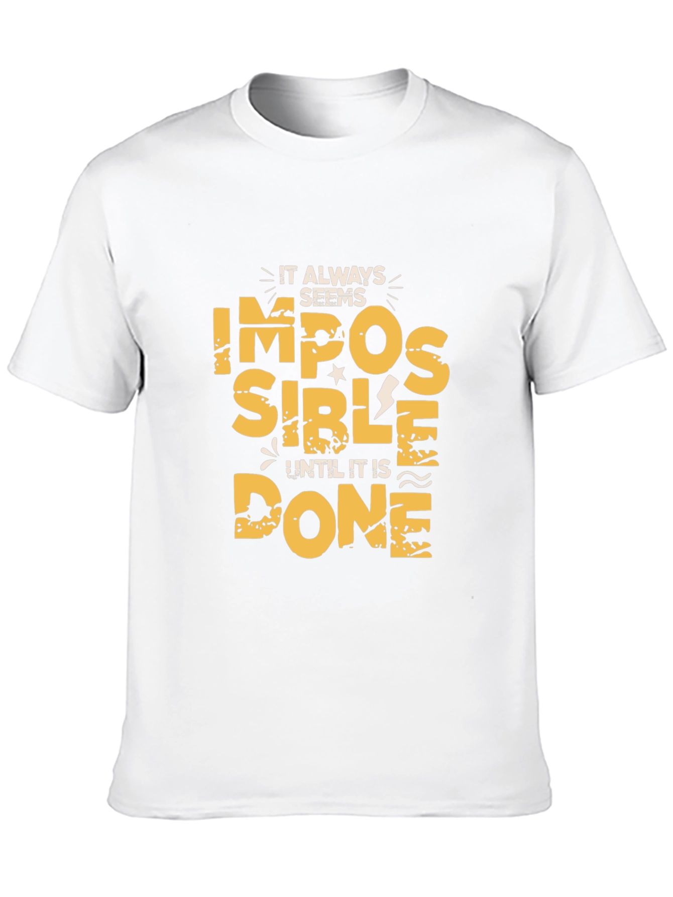 Make a statement with this bold black t-shirt featuring a motivational graphic. The design reads, "It always seems impossible until it is done" in a distressed gold font. Perfect for everyday wear, this tee combines comfort and style. Wear it to the gym, casual outings, or while relaxing at home. This is a versatile and inspiring addition to any wardrobe. A great gift for those who love inspirational messages. Get yours today and rock this awesome design!