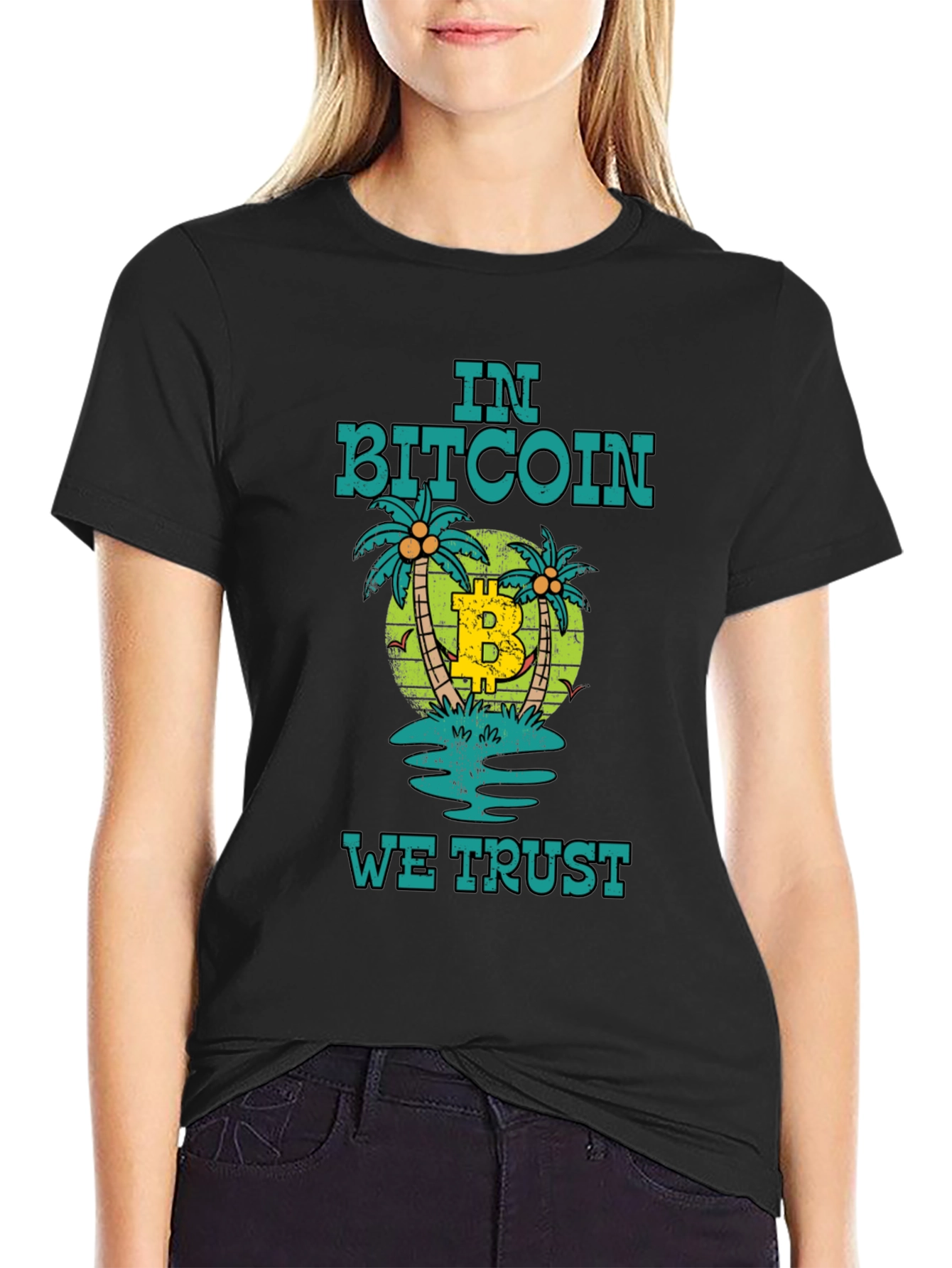 Show your support for Bitcoin with this unique t-shirt. This black tee features a fun design with palm trees, a Bitcoin logo, and the phrase "In Bitcoin We Trust." The design incorporates beachy colors of teal, green and yellow. Perfect for cryptocurrency enthusiasts, traders, or anyone who believes in the future of digital currency. Comfortable and stylish, this tee is made for everyday wear. Makes a great gift!