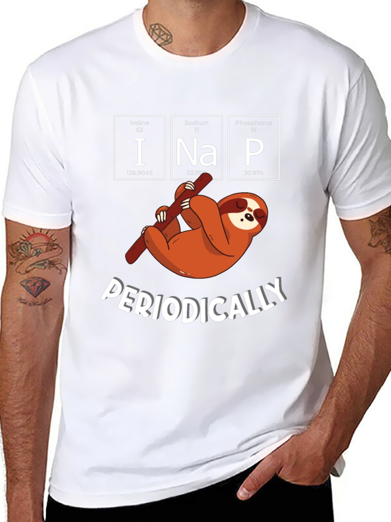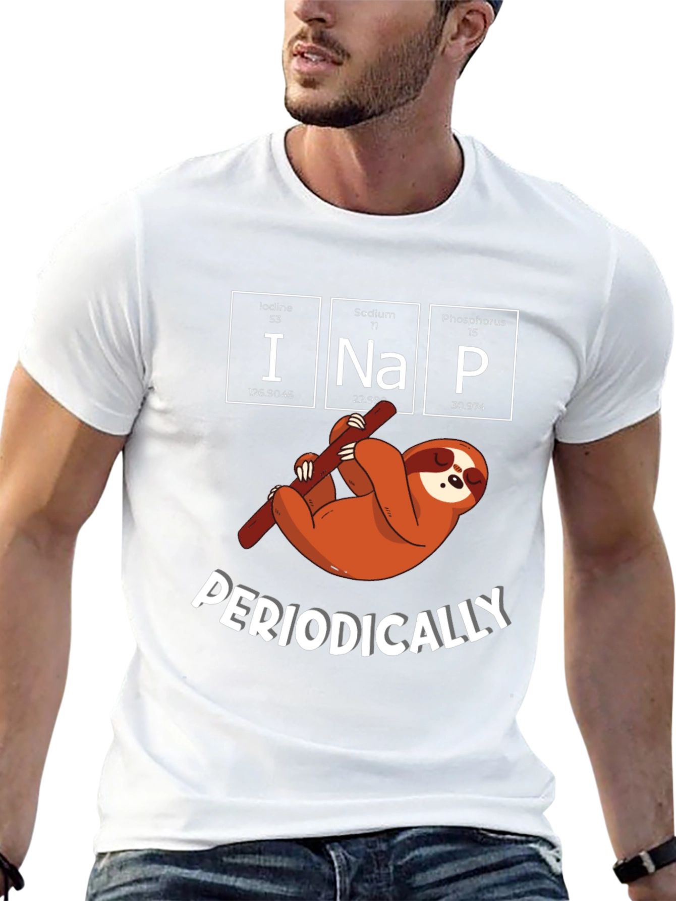 This fun black t-shirt features a clever design that's perfect for science lovers and anyone who enjoys a good nap. The design incorporates the periodic table elements Iodine (I), Sodium (Na), and Phosphorus (P), spelling out 'InaP' above an adorable cartoon sloth hanging from a branch. Below, the text reads 'PERIODICALLY' in a playful font. The shirt is a casual, comfortable fit, ideal for everyday wear, lounging at home, or making a statement at school or work. Show off your love for science and relaxation with this unique and eye-catching tee!