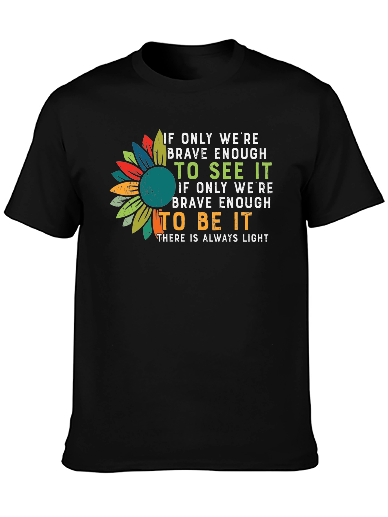 Embrace positivity with this eye-catching black graphic tee. Featuring a colorful sunflower design alongside an inspirational quote, this shirt is sure to brighten your day. The message "If only we're brave enough to see it, If only we're brave enough to be it. There is always light." is prominently displayed. The shirt appears to be made of comfortable, breathable fabric, perfect for everyday wear. Show off your uplifting spirit with this unique and stylish tee. Ideal for casual outings, motivational events, or simply spreading good vibes.