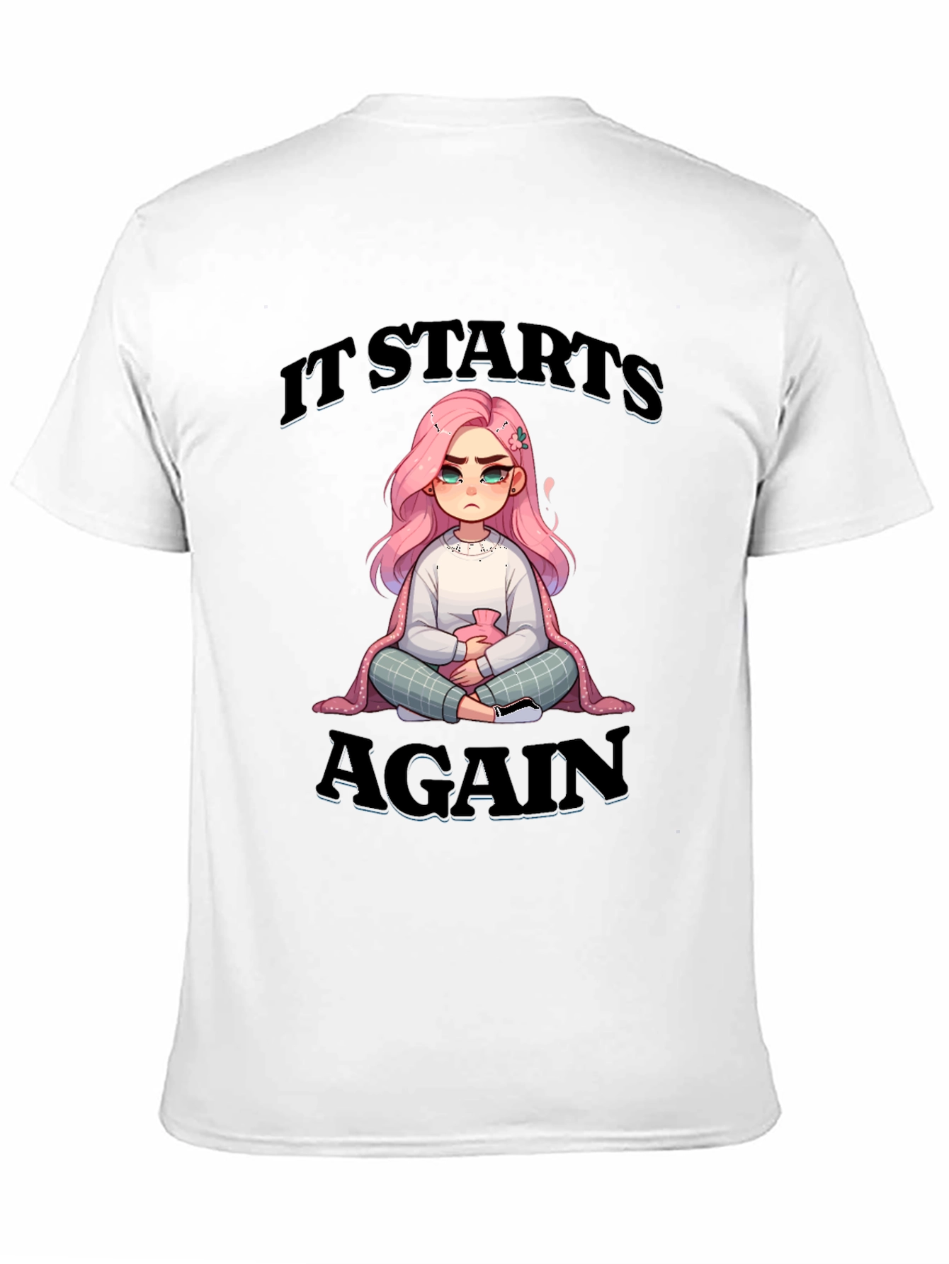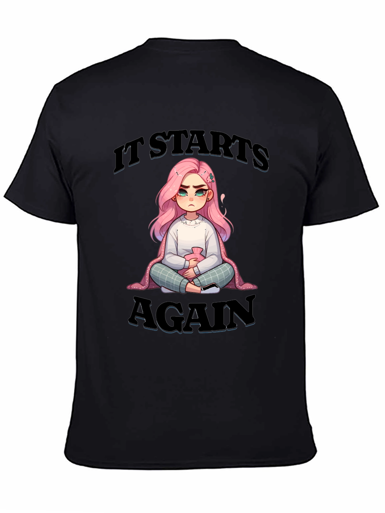 This stylish black T-shirt features a unique and eye-catching graphic design. The illustration depicts a cartoon girl with pink hair, wearing a white sweater and plaid pants. Above and below the girl are the words "IT STARTS AGAIN" in bold black lettering with a subtle shadow effect. Made from a soft, comfortable fabric, this tee is perfect for everyday wear. Pair it with jeans for a casual look or dress it up with a blazer. It's a great conversation starter and a must-have for anyone who loves cool, quirky designs. Express your individual style with this trendy T-shirt!