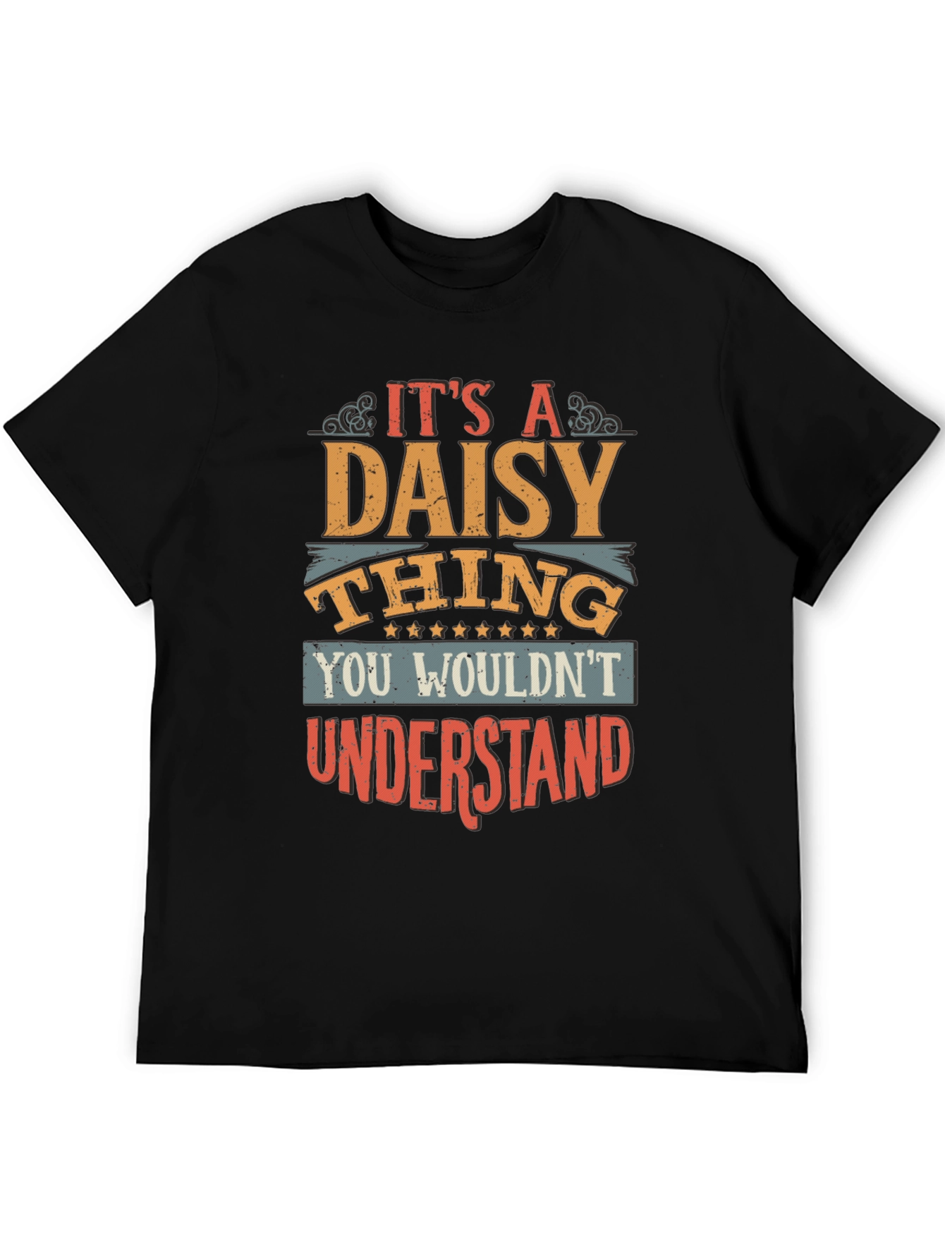 This classic fit black t-shirt features a unique graphic design. The text "It's a DAISY THING YOU WOULDN'T UNDERSTAND" is prominently displayed in a vintage-style font, with a mix of colors including tan, blue, and red. The shirt appears to be made from soft, breathable cotton, ensuring comfort for everyday wear. Perfect for casual outings, relaxed weekends, or as a fun statement piece. This shirt makes a great conversation starter and showcases a love for all things 'Daisy'. Get yours today!