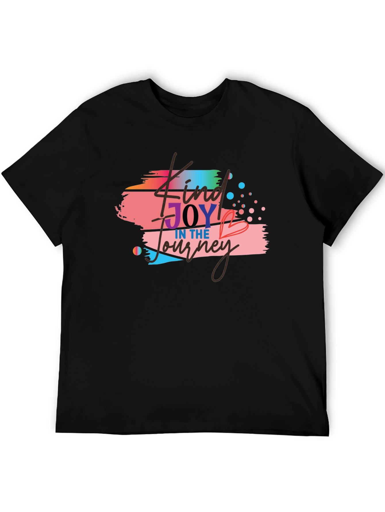 Embrace positivity with this 'Kind Joy in the Journey' graphic tee. The black t-shirt features a vibrant, artistic design with colorful strokes, adding a playful touch. Made from a soft, comfortable fabric, this tee is perfect for everyday wear. The inspiring message and eye-catching design make it a great conversation starter. Whether you're running errands, meeting friends, or relaxing at home, this tee will keep you looking stylish and feeling uplifted. Show the world your positive outlook with this unique and comfortable t-shirt.