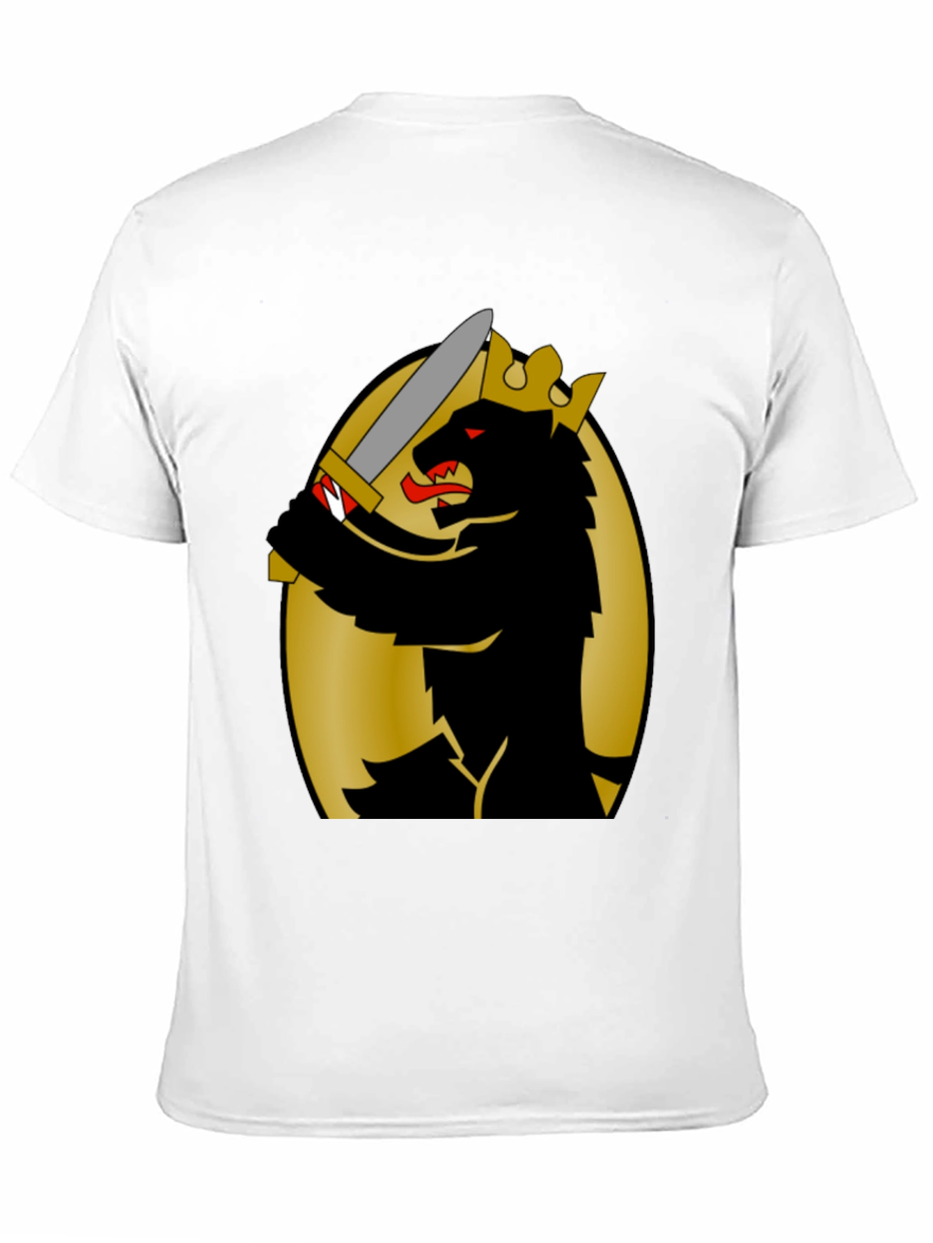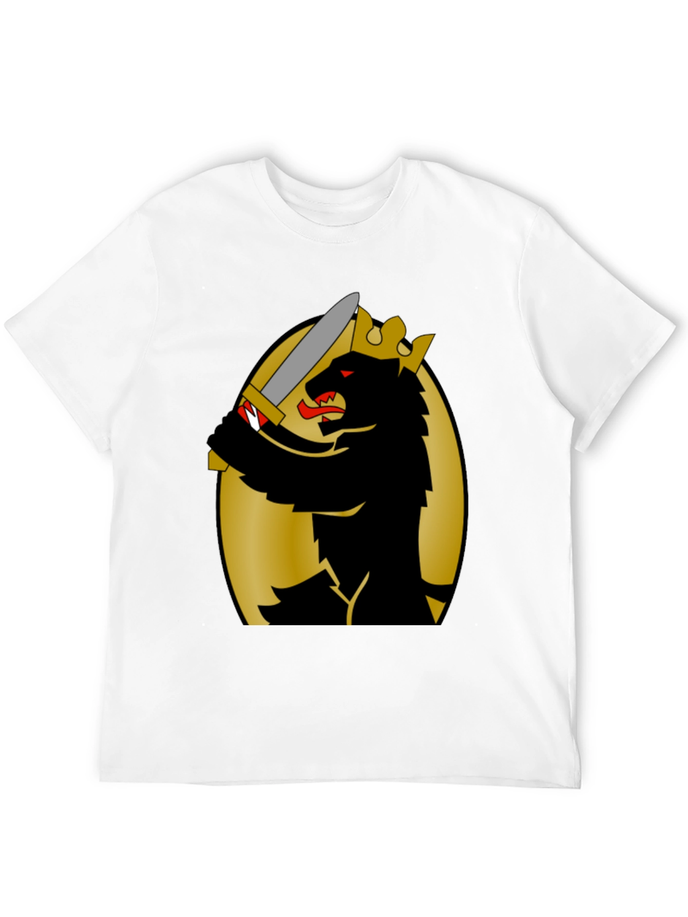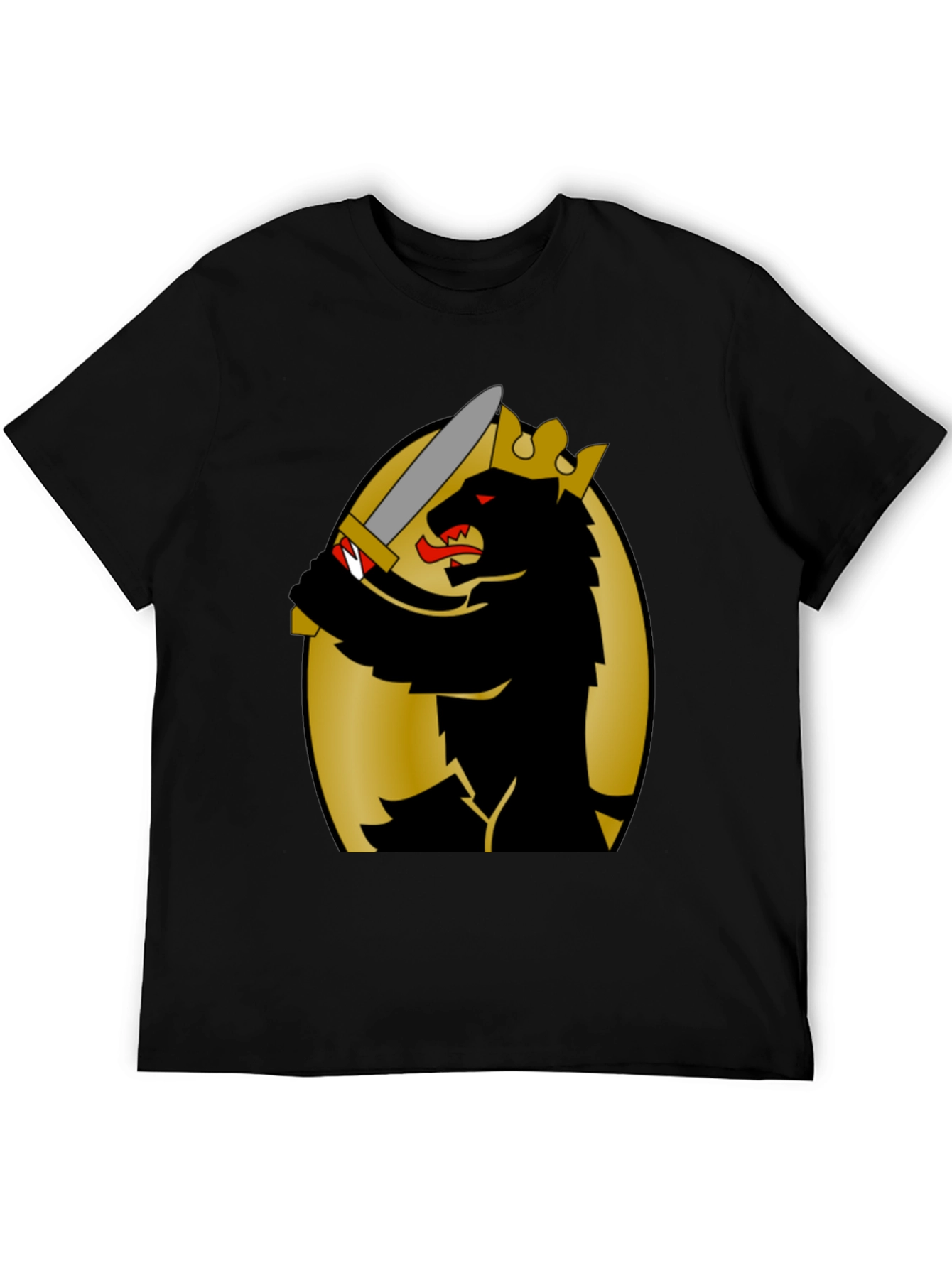This black t-shirt features a striking graphic design of a crowned bear wielding a sword, set against a gold oval backdrop. The design is eye-catching and bold, making a statement wherever you go. Made from comfortable, breathable fabric, this tee is perfect for everyday wear. Its classic fit suits a variety of body types. Show off your unique style with this cool bear design tee. Ideal for casual outings, concerts, or simply lounging at home. This t-shirt is a must-have for anyone who appreciates original artwork and wants to stand out from the crowd.