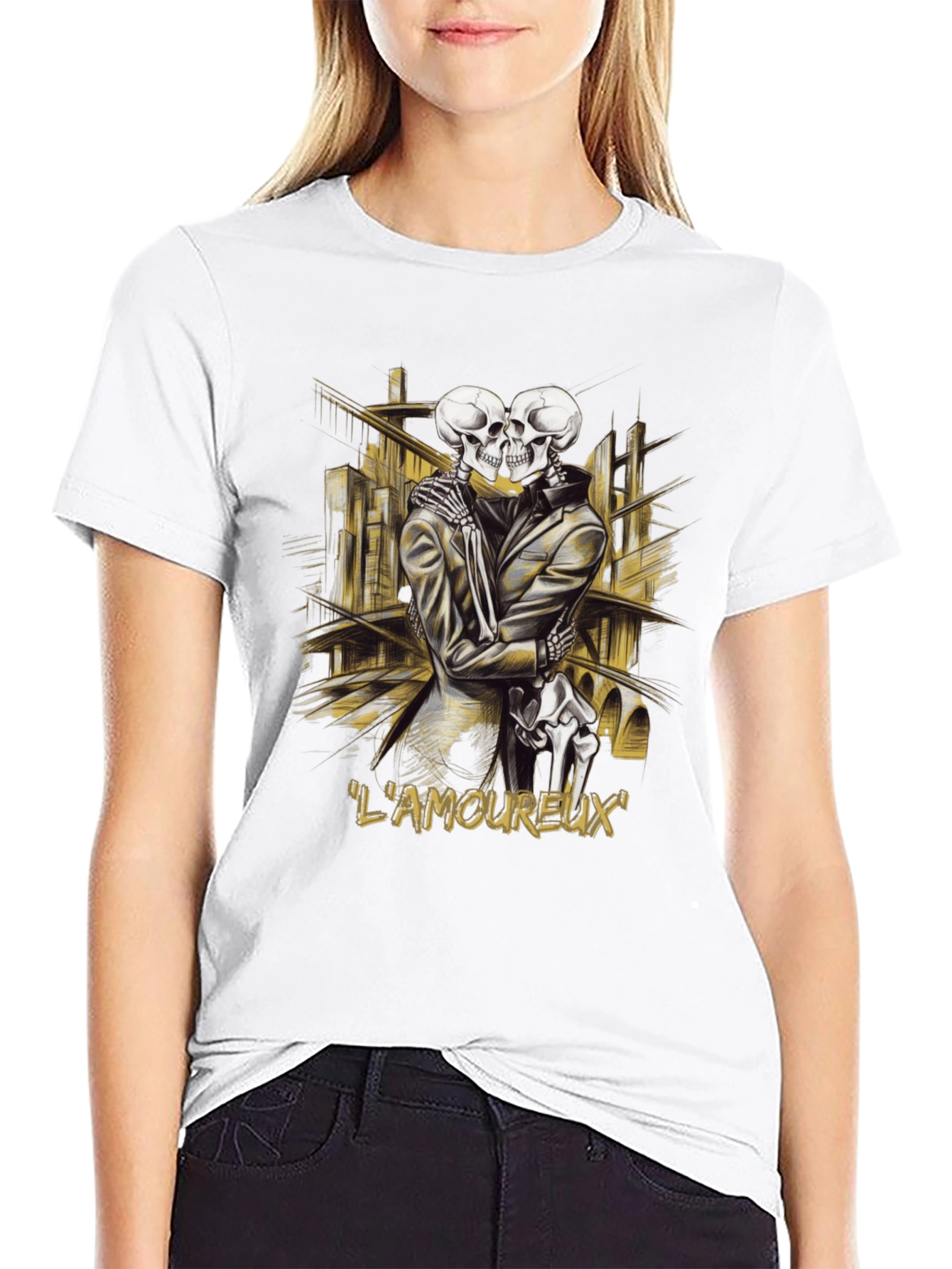 Show off your unique style with this striking black t-shirt featuring a captivating graphic. The design showcases two embracing skeletons against an urban backdrop, with the phrase "L'Amoureux" subtly integrated. This tee is perfect for those who appreciate edgy and artistic apparel. Made from comfortable fabric, it's ideal for casual wear, concerts, or making a statement wherever you go. Grab yours today and express your individuality with this eye-catching graphic tee!