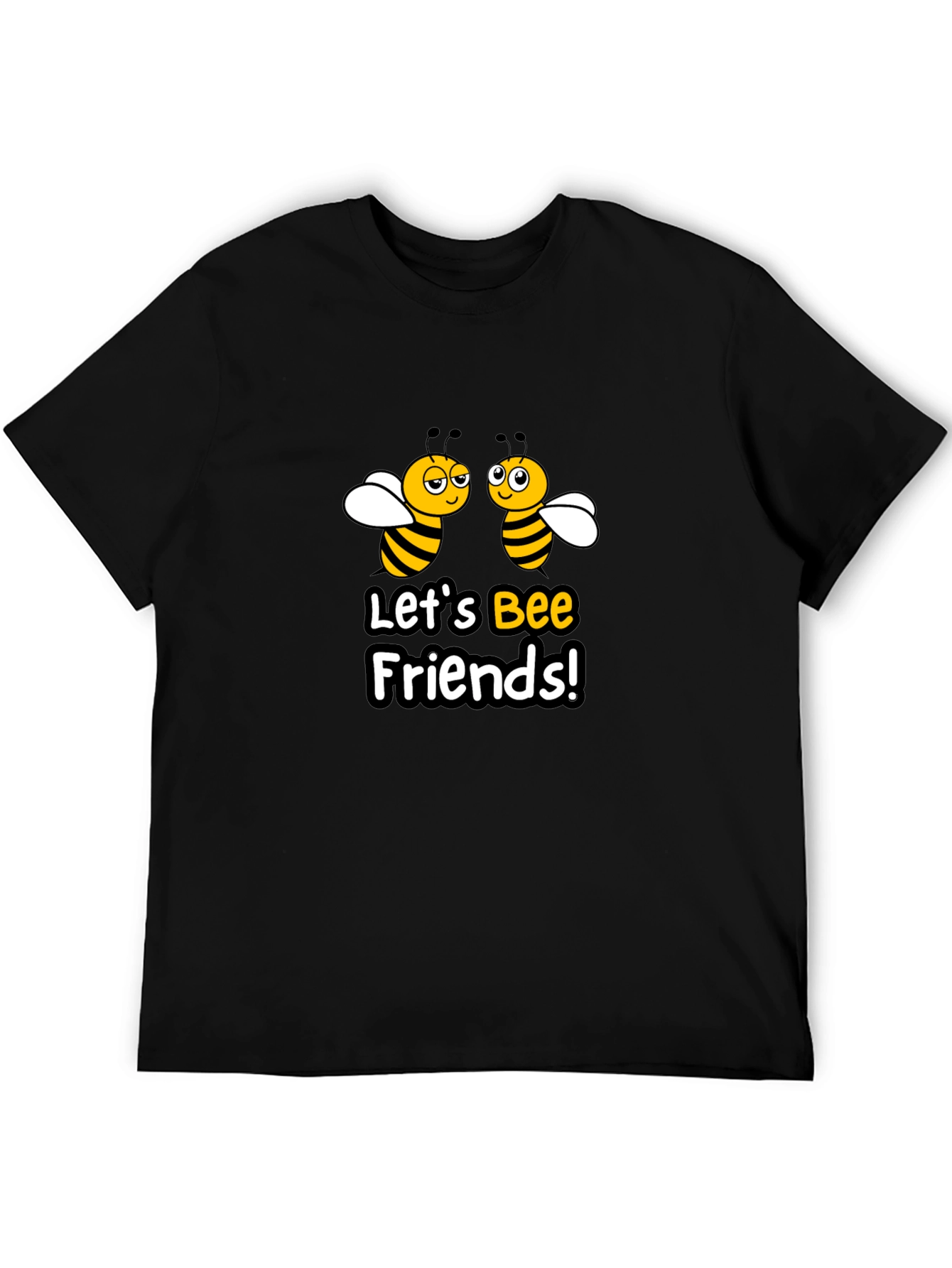 This adorable black t-shirt features a playful "Let's Bee Friends!" design with cute cartoon bees. The charming graphic is perfect for anyone who loves bees or wants to spread a message of friendship and positivity. Made from a soft-looking fabric, this tee offers a comfortable fit and a stylish casual look. Wear it for everyday outings, picnics, or as a fun statement piece. It's a great way to show off your quirky and friendly side. This design is sure to bring a smile to anyone who sees it!