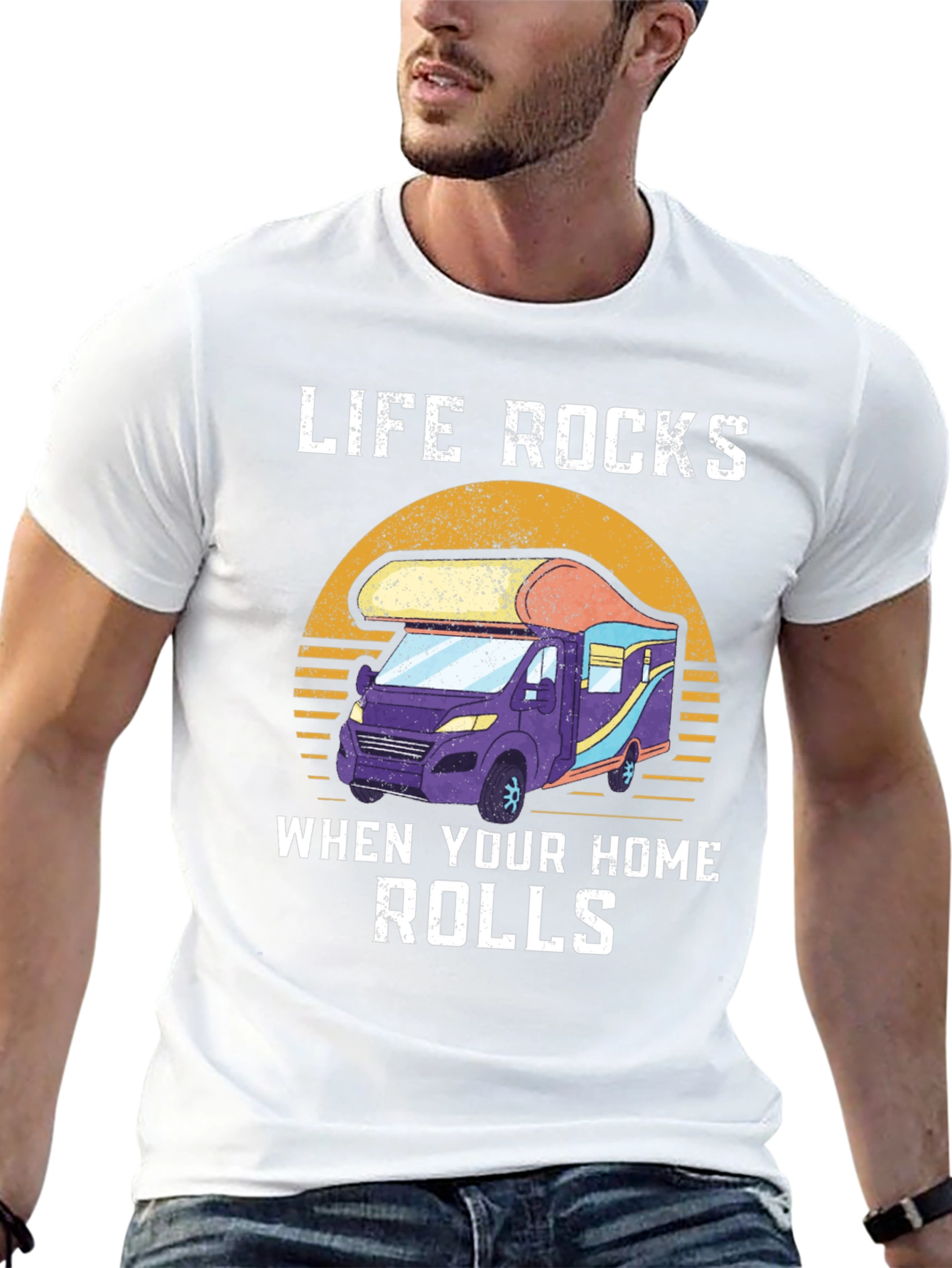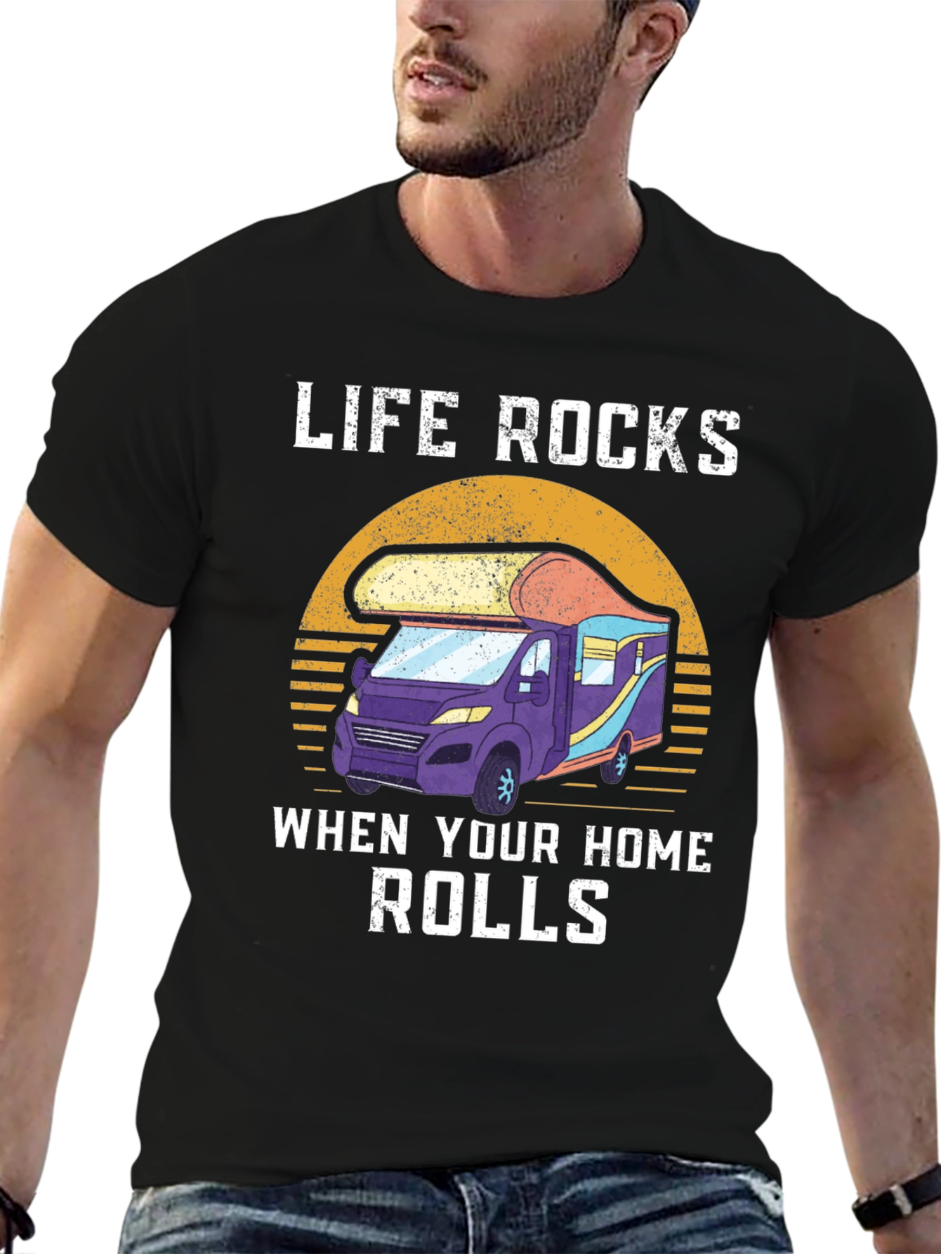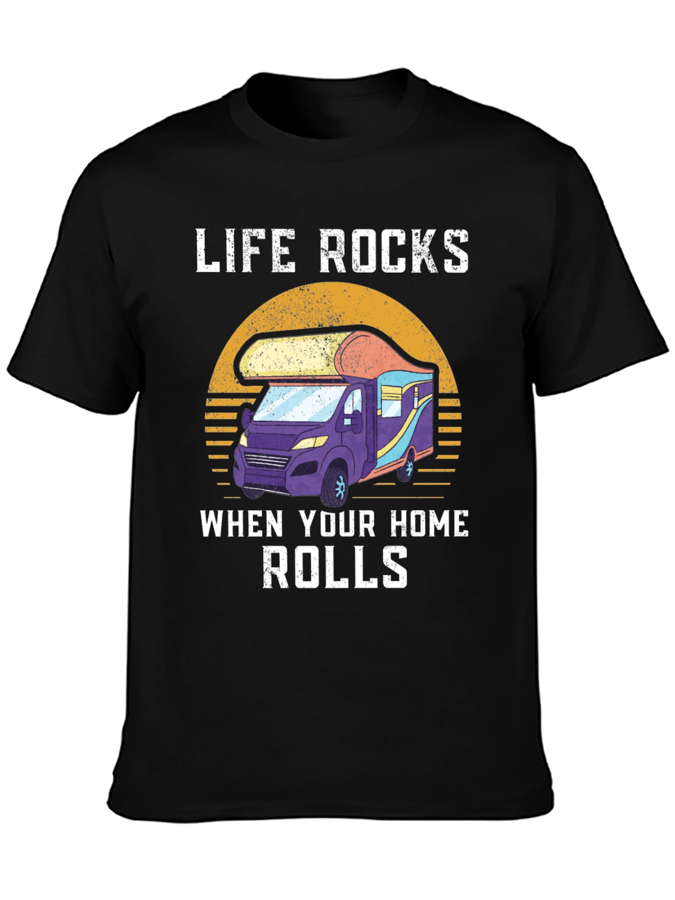 Embrace the open road with this unique t-shirt! This black tee features a vibrant graphic of a recreational vehicle set against a retro sunset. The design is complemented by the phrase "LIFE ROCKS WHEN YOUR HOME ROLLS," perfect for RV enthusiasts and adventure seekers. Made from soft, breathable fabric, this shirt is comfortable for everyday wear, whether you're exploring new landscapes or simply relaxing at the campsite. Show off your love for the RV lifestyle with this stylish and inspiring tee!