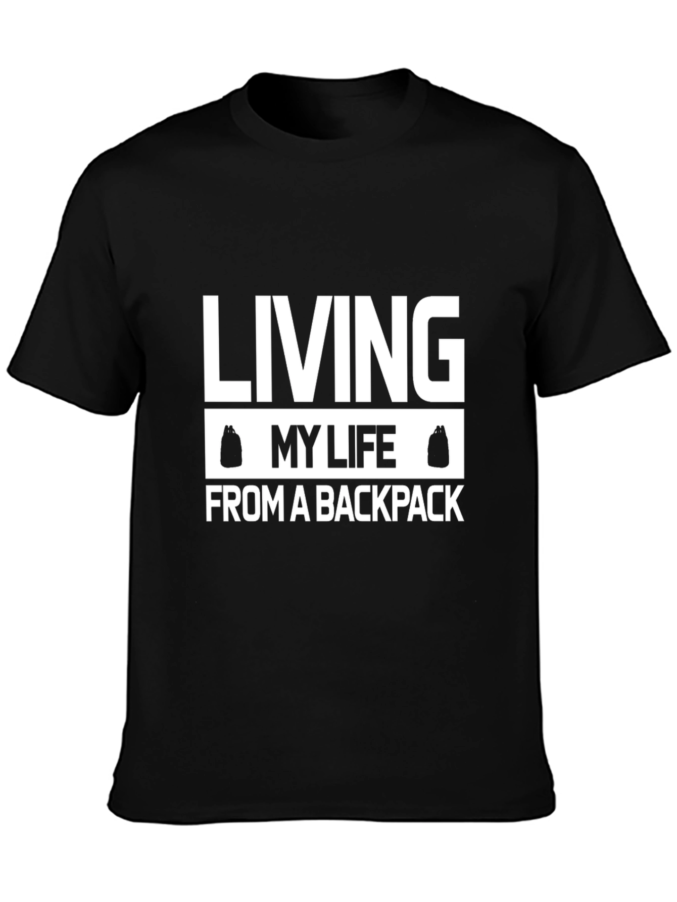 Express your adventurous spirit with this black graphic t-shirt. Featuring a bold white print that reads "LIVING MY LIFE FROM A BACKPACK," this tee embodies the wanderlust lifestyle. Two minimalist backpack icons sandwich the phrase 'MY LIFE' adding a touch of visual interest. The classic crew neck and short sleeve design make it a comfortable and versatile choice for everyday wear. Crafted from a soft-looking fabric, this t-shirt is perfect for travel enthusiasts and free spirits alike. Wear it on your next backpacking trip, casual outings, or simply to showcase your love for adventure.