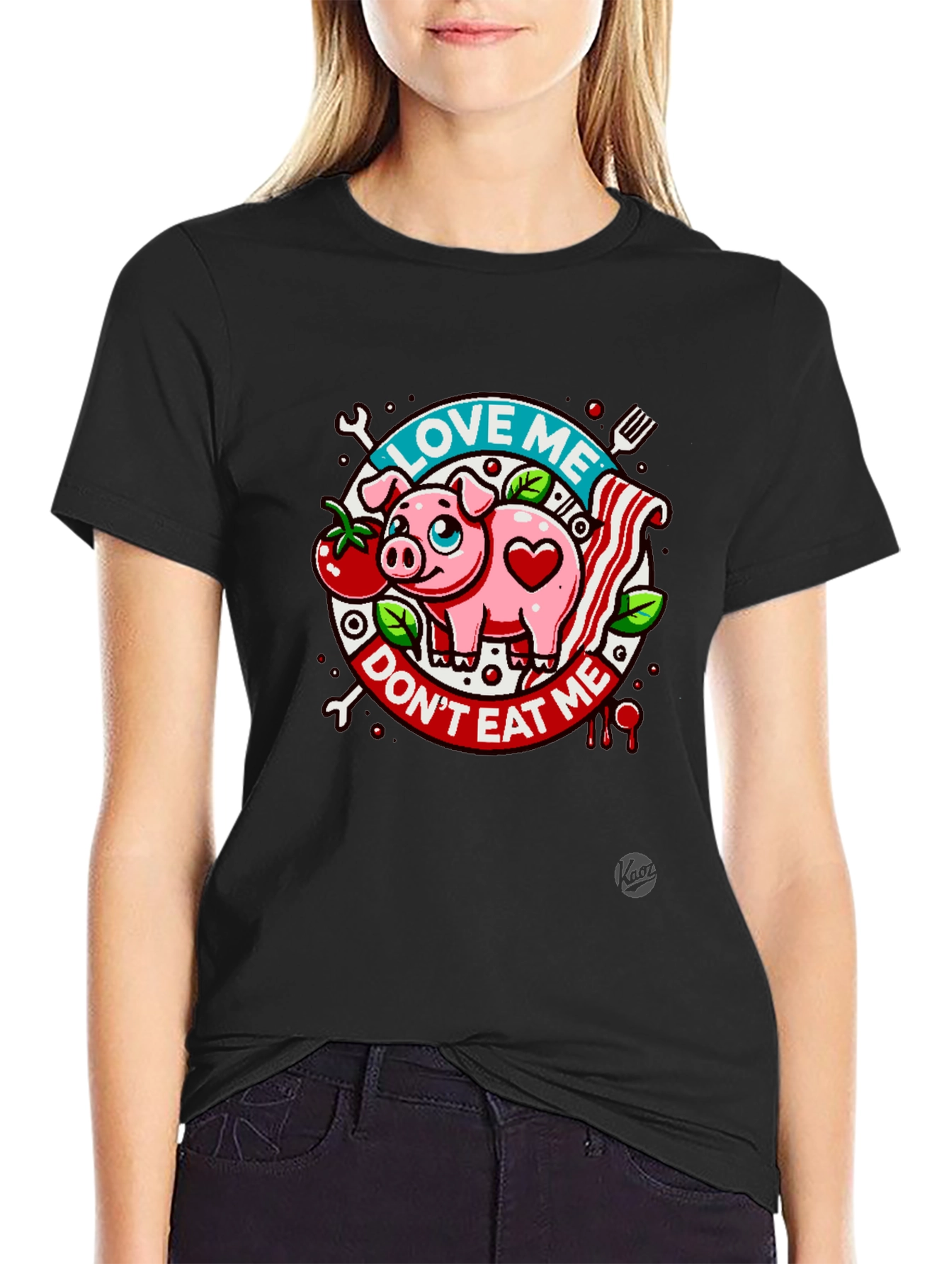 This eye-catching black t-shirt features a vibrant graphic design. The design showcases a cute pig with a heart, surrounded by playful elements like a tomato, bacon, and utensils. The message "Love Me Don't Eat Me" is prominently displayed, advocating for animal rights and veganism. This tee is perfect for individuals passionate about animal welfare and ethical eating. Wear it to spread awareness and spark conversations. Made from comfortable material, this shirt is suitable for everyday wear and makes a bold statement. Show your support for a kinder world with this unique and expressive tee.