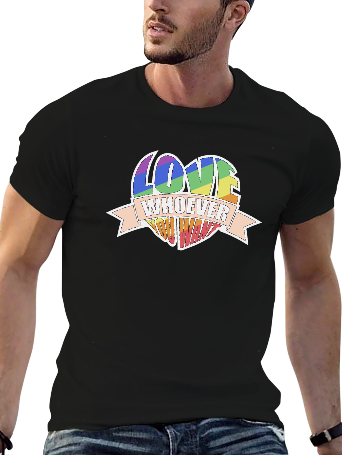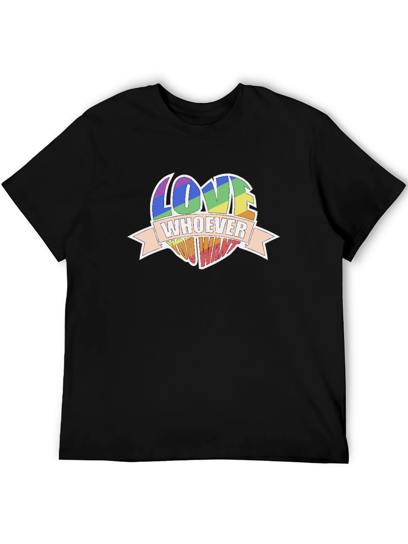 Express yourself with this eye-catching black t-shirt. Featuring a vibrant, rainbow-colored heart design with the empowering message "Love Whoever You Want", this tee is perfect for making a statement. The bold graphic is printed on a comfortable, classic fit tee. Made from soft, breathable fabric, this shirt is ideal for everyday wear. Whether you're heading to a pride event, hanging out with friends, or just want to spread a message of love and acceptance, this t-shirt is a perfect choice. Show your support for love and equality with this stylish and meaningful garment.