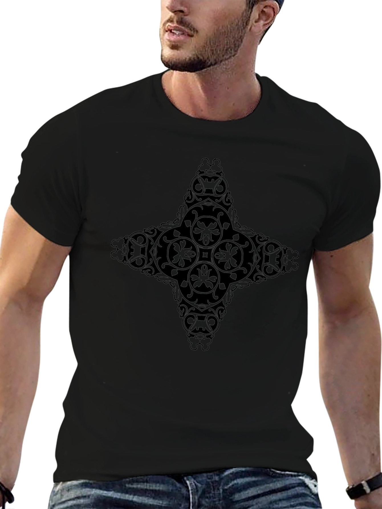 This stylish men's black t-shirt features a unique ornate cross design, making it a standout piece in any casual wardrobe. The intricate graphic adds a touch of sophistication to the classic tee, perfect for expressing your individual style. Made from a soft-looking comfortable fabric, this shirt offers both style and comfort for everyday wear. The short sleeves and crew neck provide a relaxed fit. Dress it up with dark jeans or dress it down with casual wear. The design also lends itself to a stylish night out. Whether you're hitting the streets or lounging at home, this graphic tee is a versatile and fashionable choice.