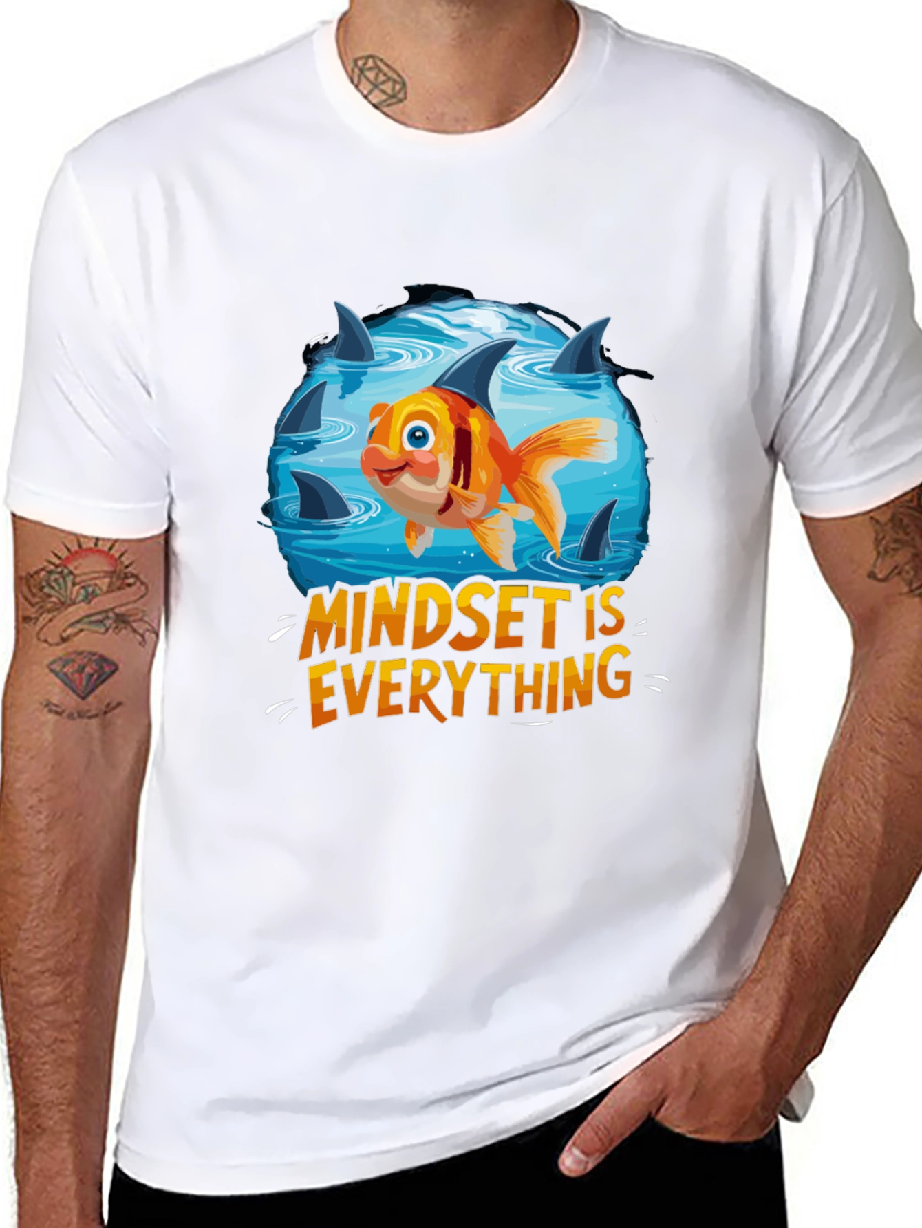 Showcase your positive attitude with this black t-shirt featuring a whimsical and inspiring design. The graphic depicts a cheerful goldfish surrounded by shark fins, accompanied by the bold text "MINDSET IS EVERYTHING." The design is vibrant and eye-catching, perfect for making a statement. Made from comfortable fabric, this tee is ideal for everyday wear. Whether you're heading to school, running errands, or just relaxing at home, this t-shirt will inspire you and those around you to maintain a positive outlook. A great addition to any casual wardrobe.