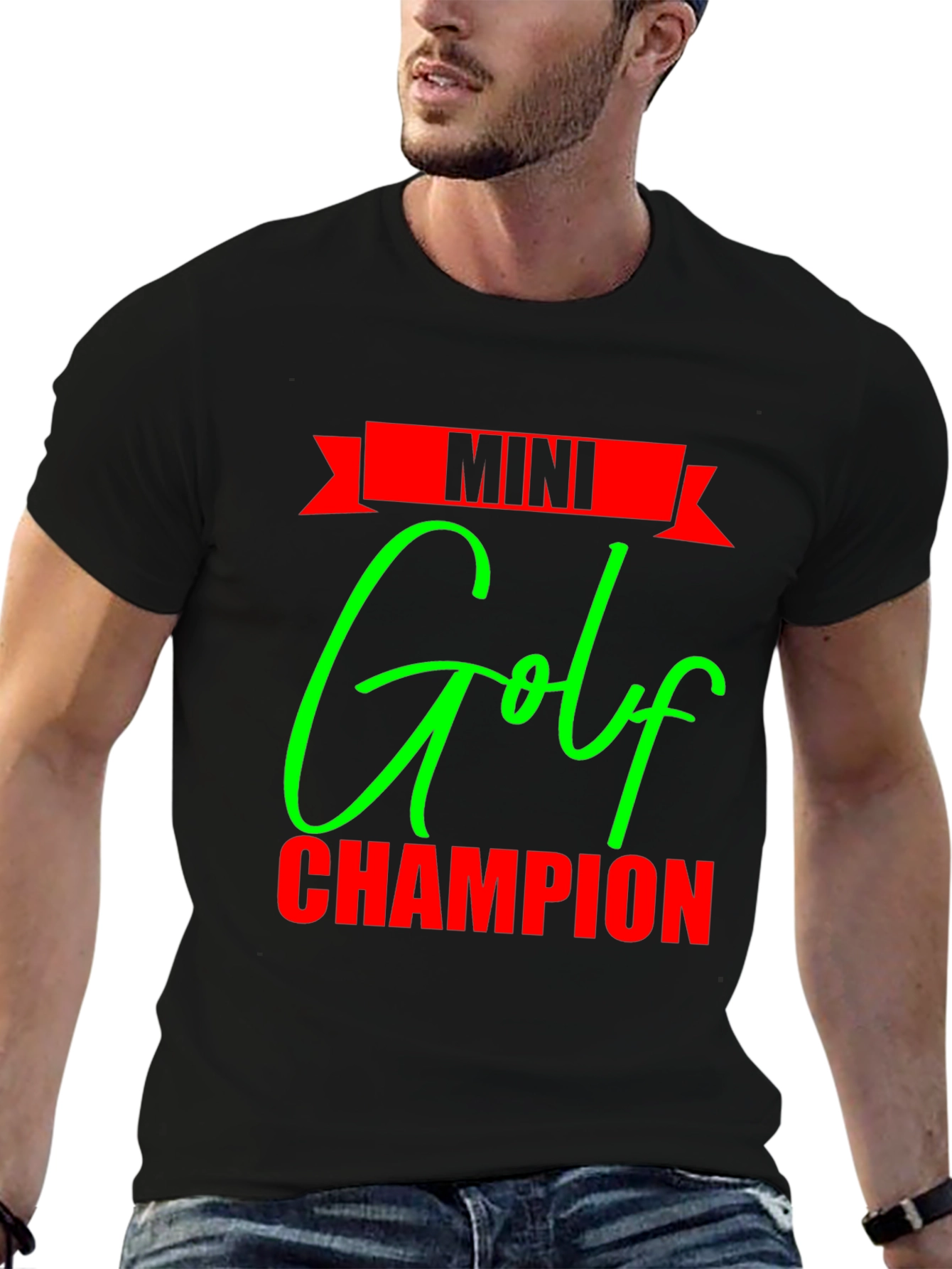 Showcase your mini golf prowess with this stylish black t-shirt. Featuring a bold design with "MINI" emblazoned on a red banner, followed by a vibrant green cursive "Golf" and a confident "CHAMPION" in red block letters. This shirt is not only eye-catching but also comfortable, perfect for casual wear, mini golf outings, or even themed parties. Let everyone know who the true champion is with this statement piece.