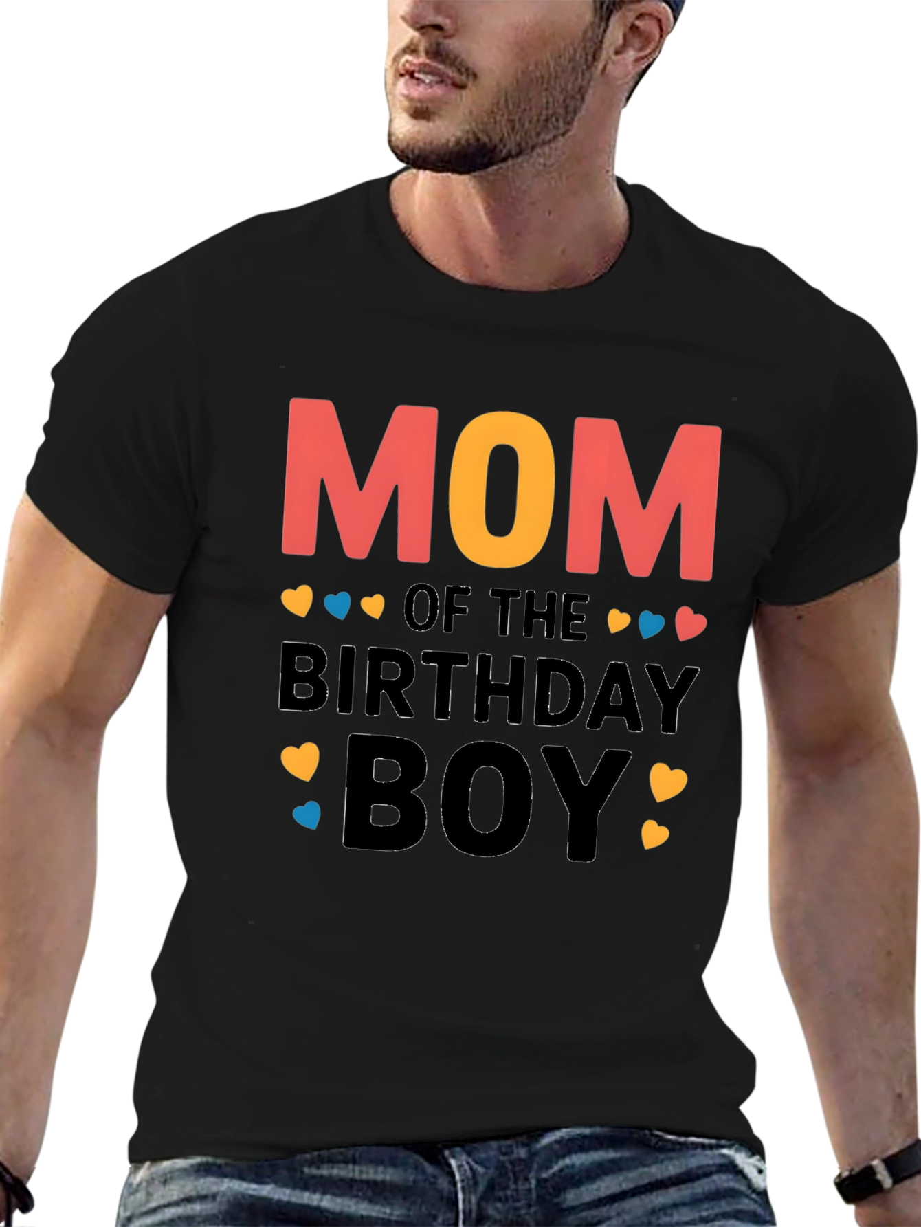 Celebrate your son's special day with this adorable "Mom of the Birthday Boy" t-shirt! This black t-shirt features a playful design with the word "MOM" in coral and yellow lettering, followed by "of the BIRTHDAY BOY" in a bold font. The design also includes colorful heart accents adding a touch of love and celebration. Made from a comfortable fabric, this t-shirt is perfect for wearing to your son's birthday party or any casual occasion. Show your love and pride as the Mom of the birthday boy!