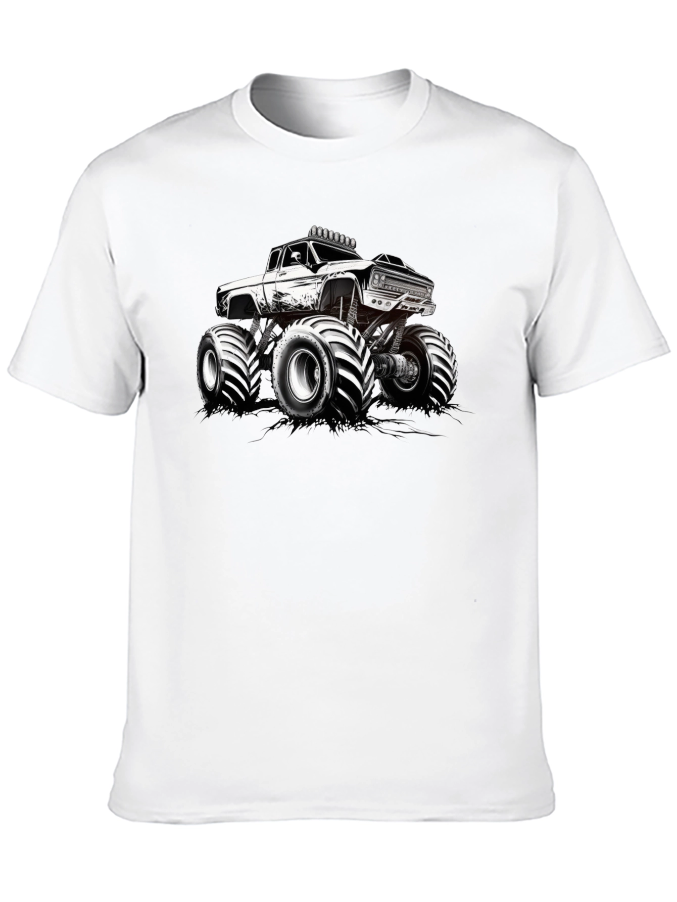 Showcase your love for monster trucks with this bold graphic tee. The design features a high-contrast illustration of a classic monster truck with oversized tires. Made from comfortable, breathable fabric, this shirt is perfect for casual wear. The black background emphasizes the truck's design, making it pop. Wear it to car shows, races, or just hanging out with friends. A great gift for monster truck fans.