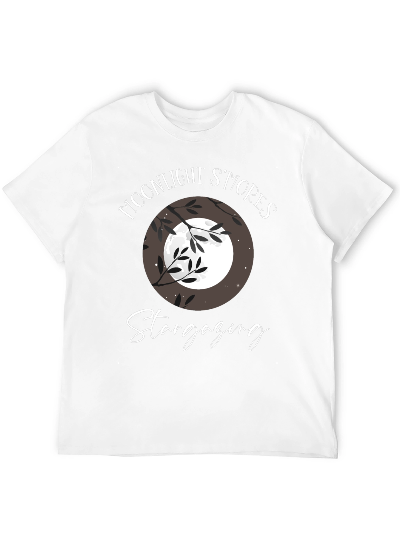 Embrace the night with this stylish black graphic tee. Featuring a captivating design of a full moon partially obscured by tree branches set against a starry night background. Above and below the graphic are the words "Moonlight S'mores" and "Stargazing", evoking a sense of wonder and adventure. Made from comfortable, breathable fabric, this tee is perfect for casual wear or cozy evenings under the stars. Whether you're gathering around a campfire or simply lounging at home, this t-shirt is a must-have for nature lovers and stargazers alike. Add this unique piece to your wardrobe and let your passion for the cosmos shine.
