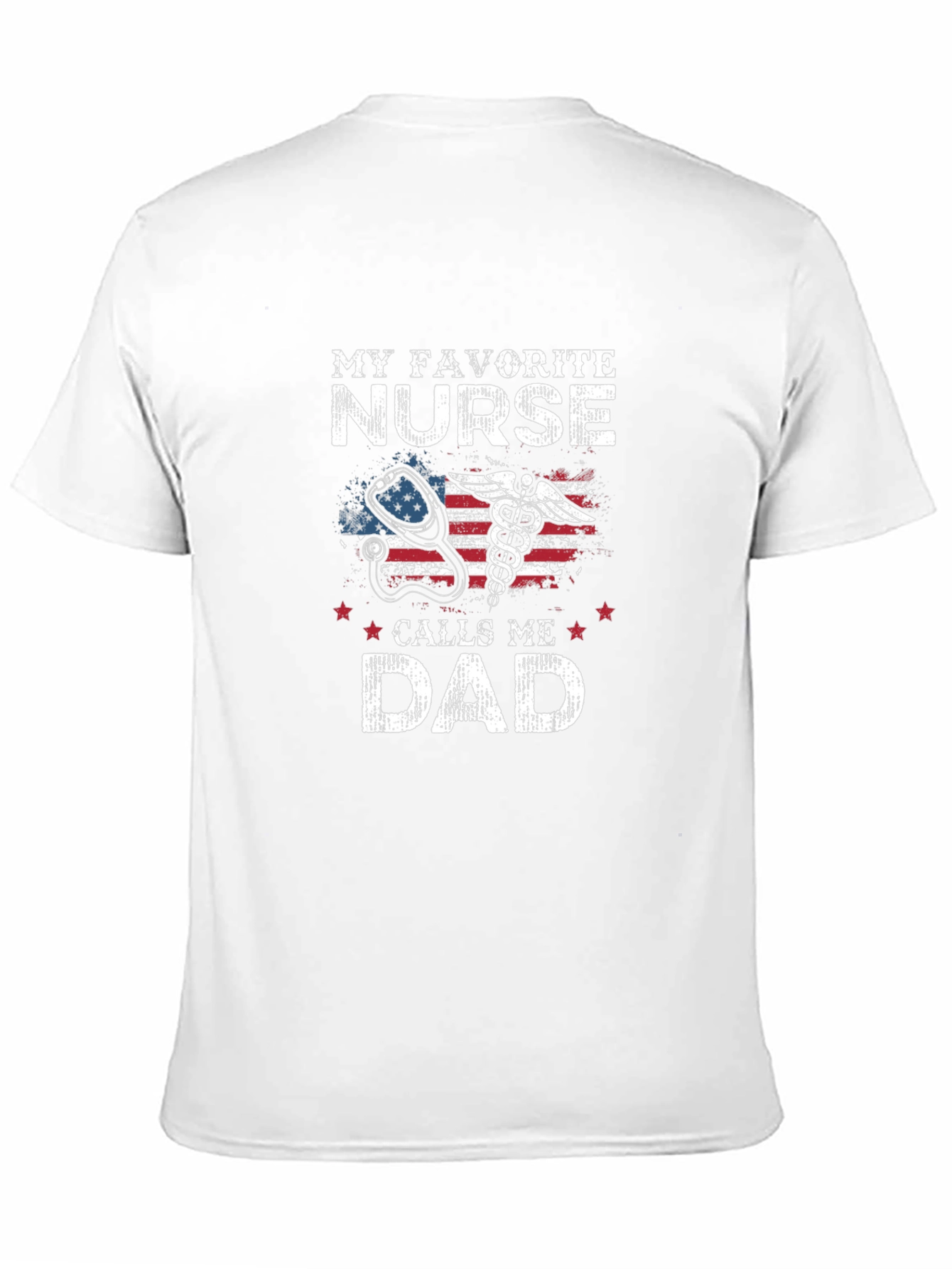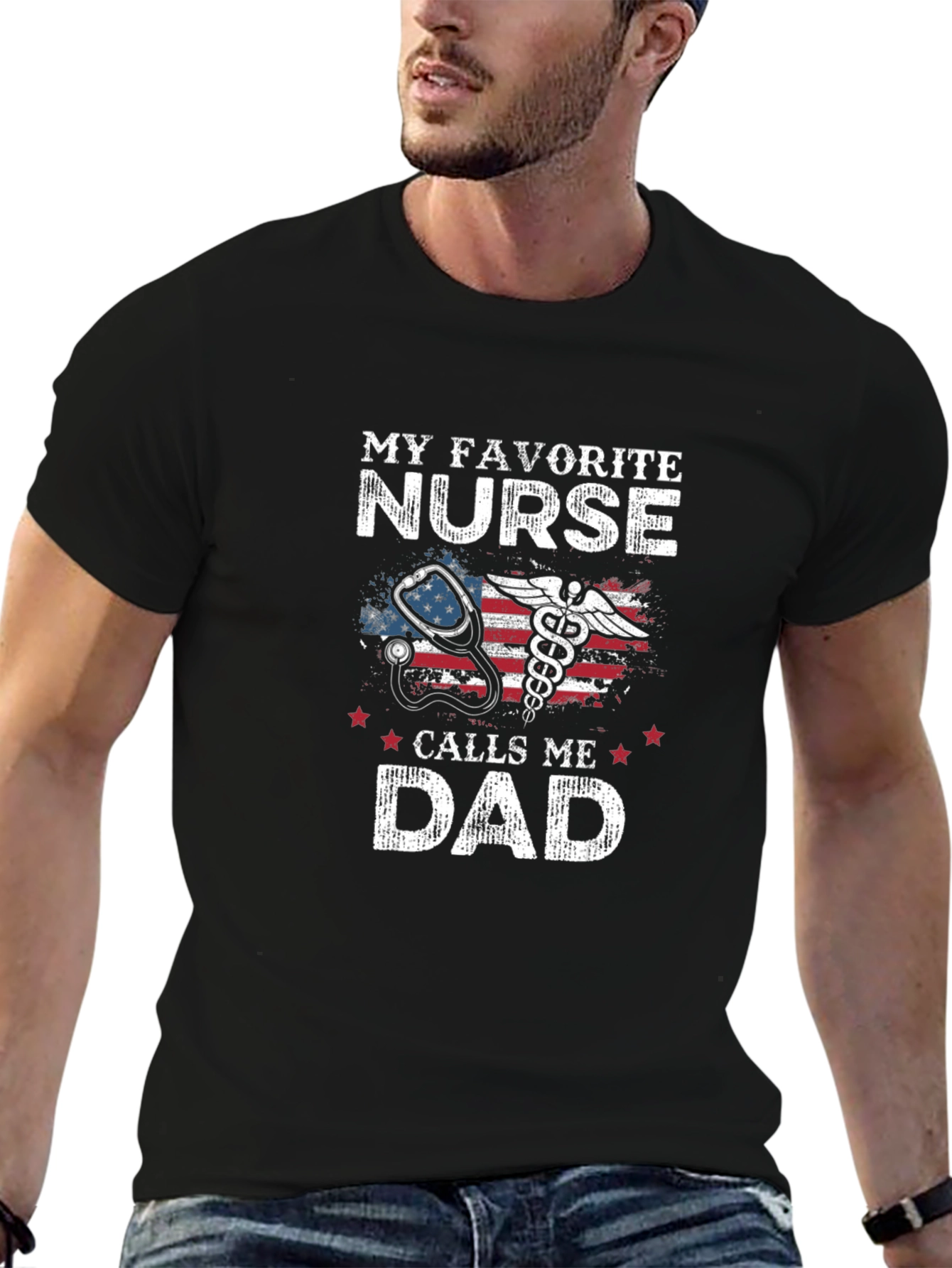 Show your pride with this black t-shirt! Features the text "My Favorite Nurse" above an image of an American flag with a stethoscope and caduceus, and the text "Calls Me Dad" below. Ideal for proud fathers of nurses, this shirt is made from comfortable material for everyday wear. Perfect for casual outings, family gatherings, or as a thoughtful gift. Let everyone know you're the proud dad of a fantastic nurse!
