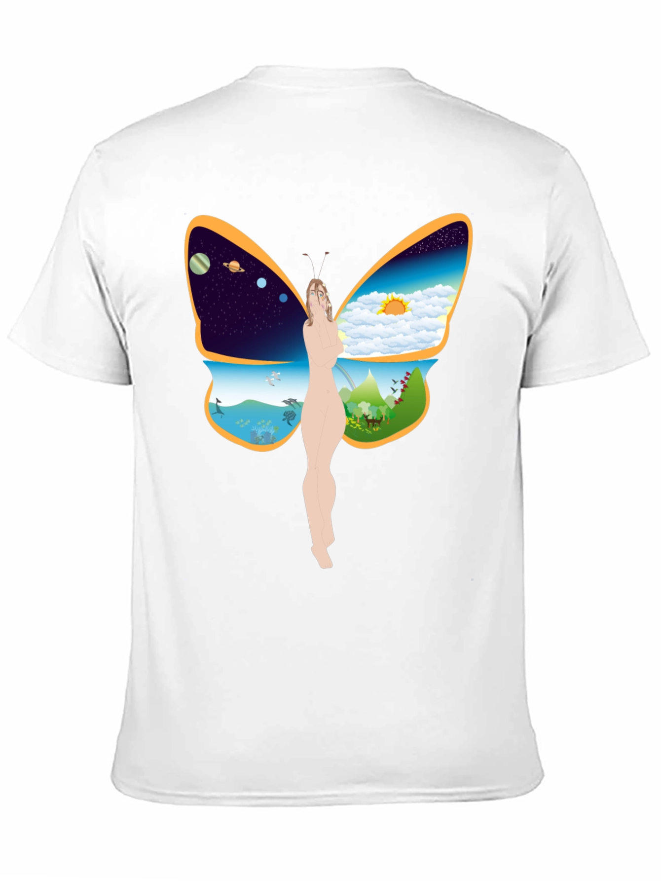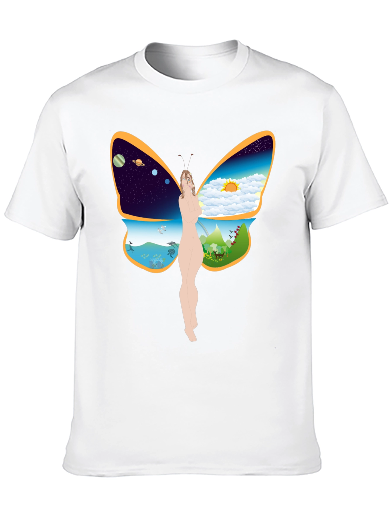 Embrace the beauty of nature with this unique graphic t-shirt. Featuring a stylized butterfly design with a nude woman, one wing showcases a celestial night sky while the other captures a serene daytime landscape. The bottom halves shows a beach and a grassland. Made from comfortable, breathable fabric, this tee is perfect for casual wear and makes a bold statement. The classic fit ensures all-day comfort, while the eye-catching graphic adds a touch of individuality to any outfit. Express your love for nature and art with this stunning piece!