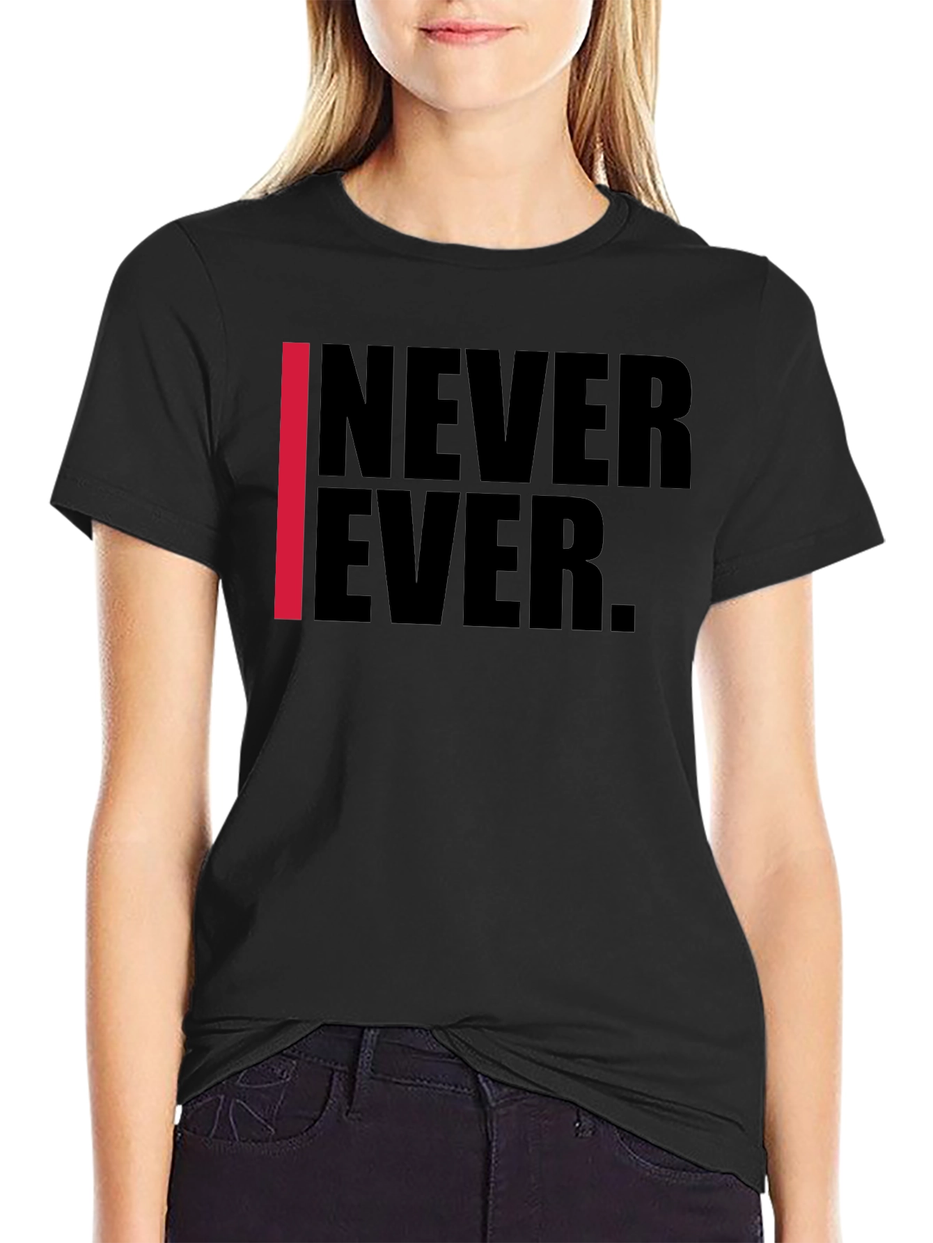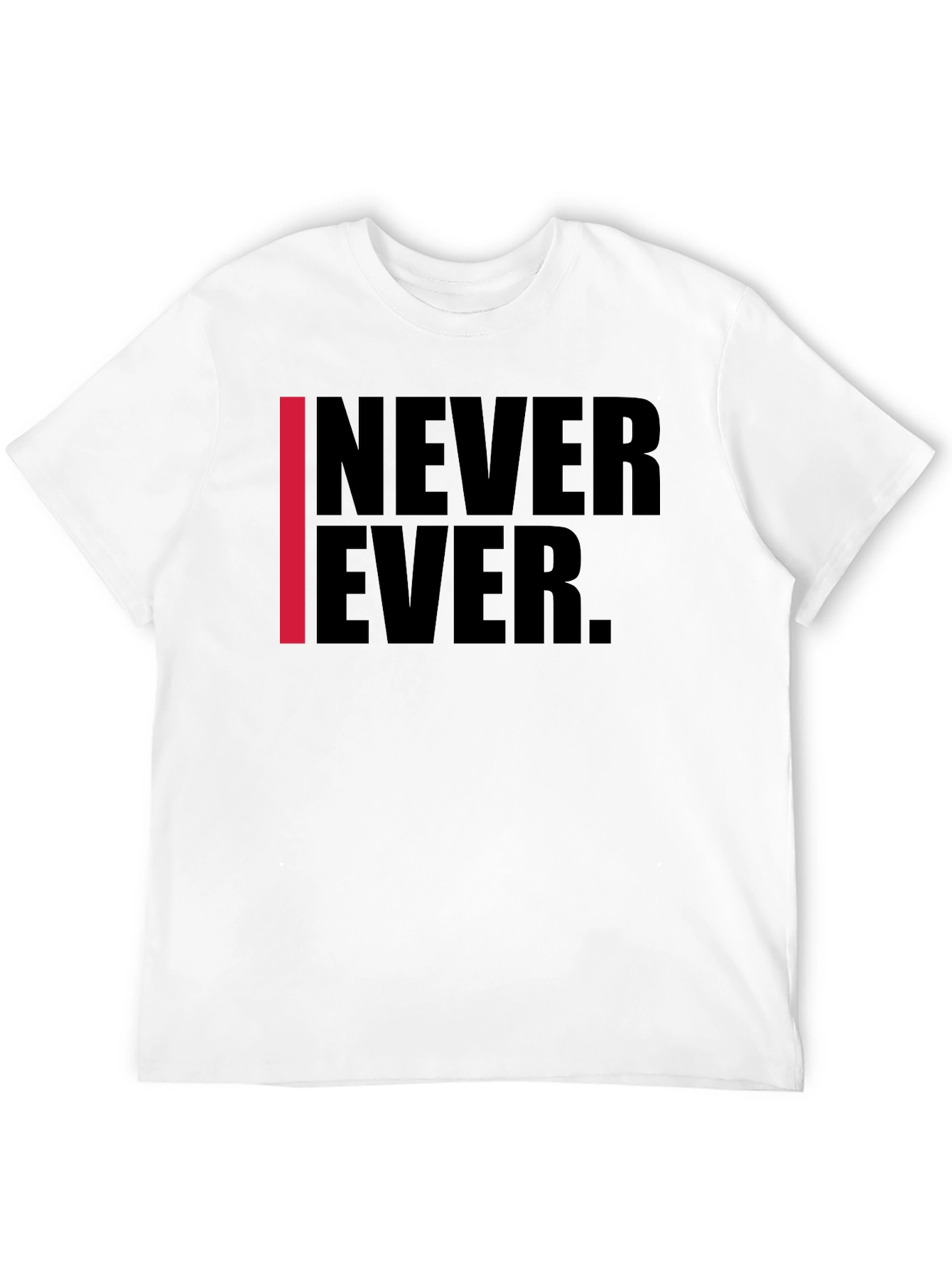 Make a statement with this sleek black t-shirt featuring a bold "NEVER EVER" graphic. The design incorporates a vertical red stripe for a touch of edgy contrast. Made from comfortable material, this tee offers a classic fit for everyday wear. Ideal for casual outings, concerts, or expressing your unique style, this t-shirt will set you apart. Pair it with jeans, shorts, or joggers for a cool, laid-back look. Show the world your individual style with this must-have graphic tee.