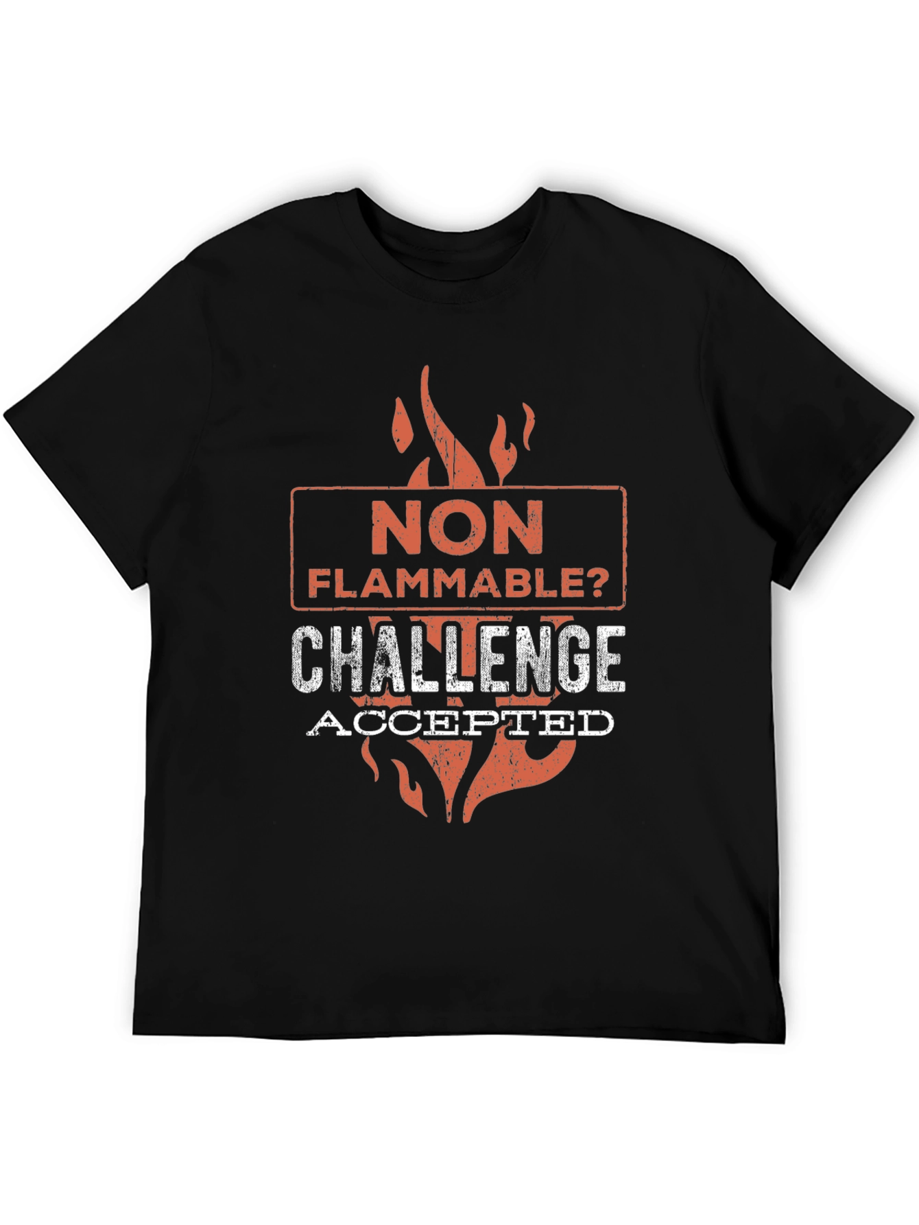 This black t-shirt features a bold and humorous design. The graphic displays the words 'NON FLAMMABLE?' stacked on top of 'CHALLENGE' and 'ACCEPTED', styled with a distressed, grunge aesthetic. The text is framed by stylized orange flames. This unique design makes a statement, perfect for casual wear, parties, or as a fun gift for someone with a bold sense of humor. The material appears to be a soft and comfortable cotton blend, making it ideal for everyday use. Stand out from the crowd with this edgy and eye-catching t-shirt.