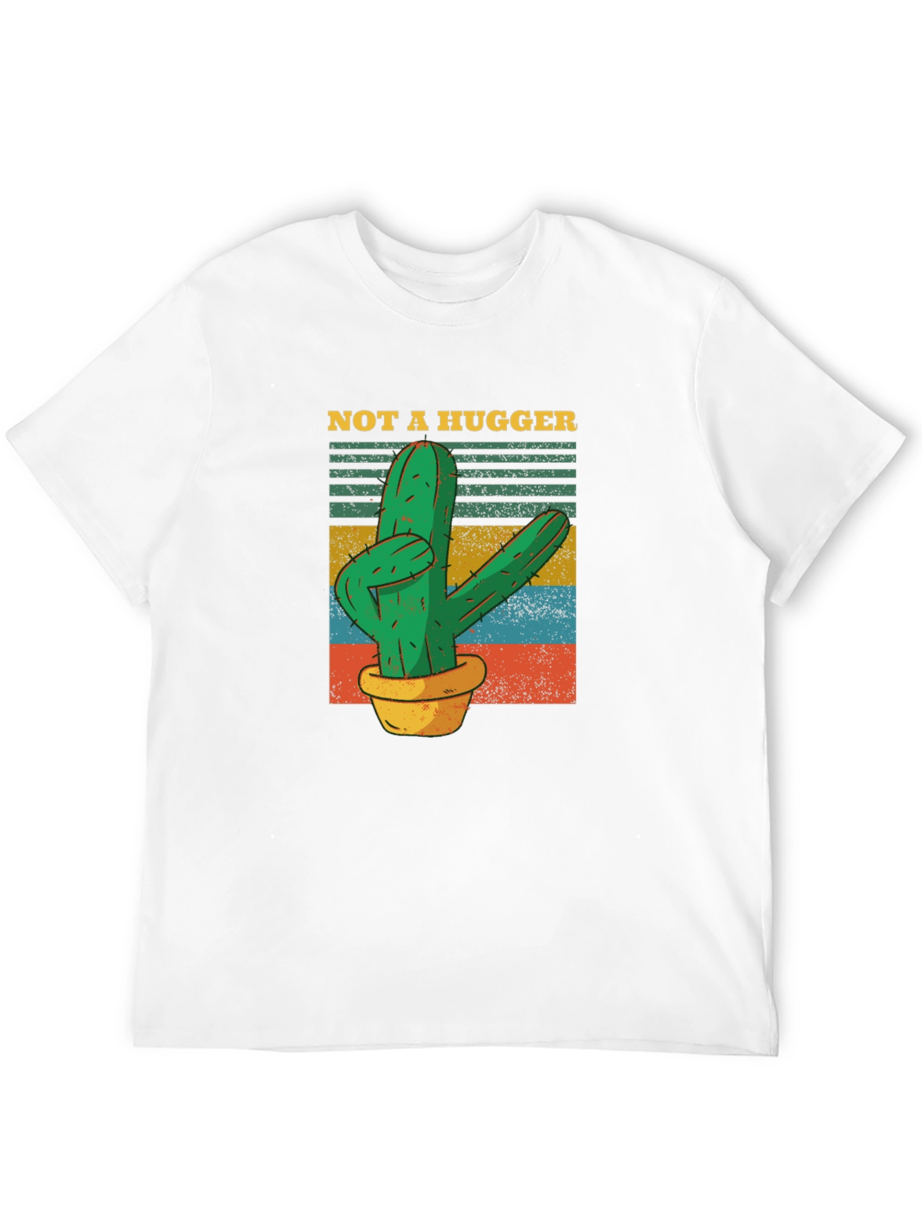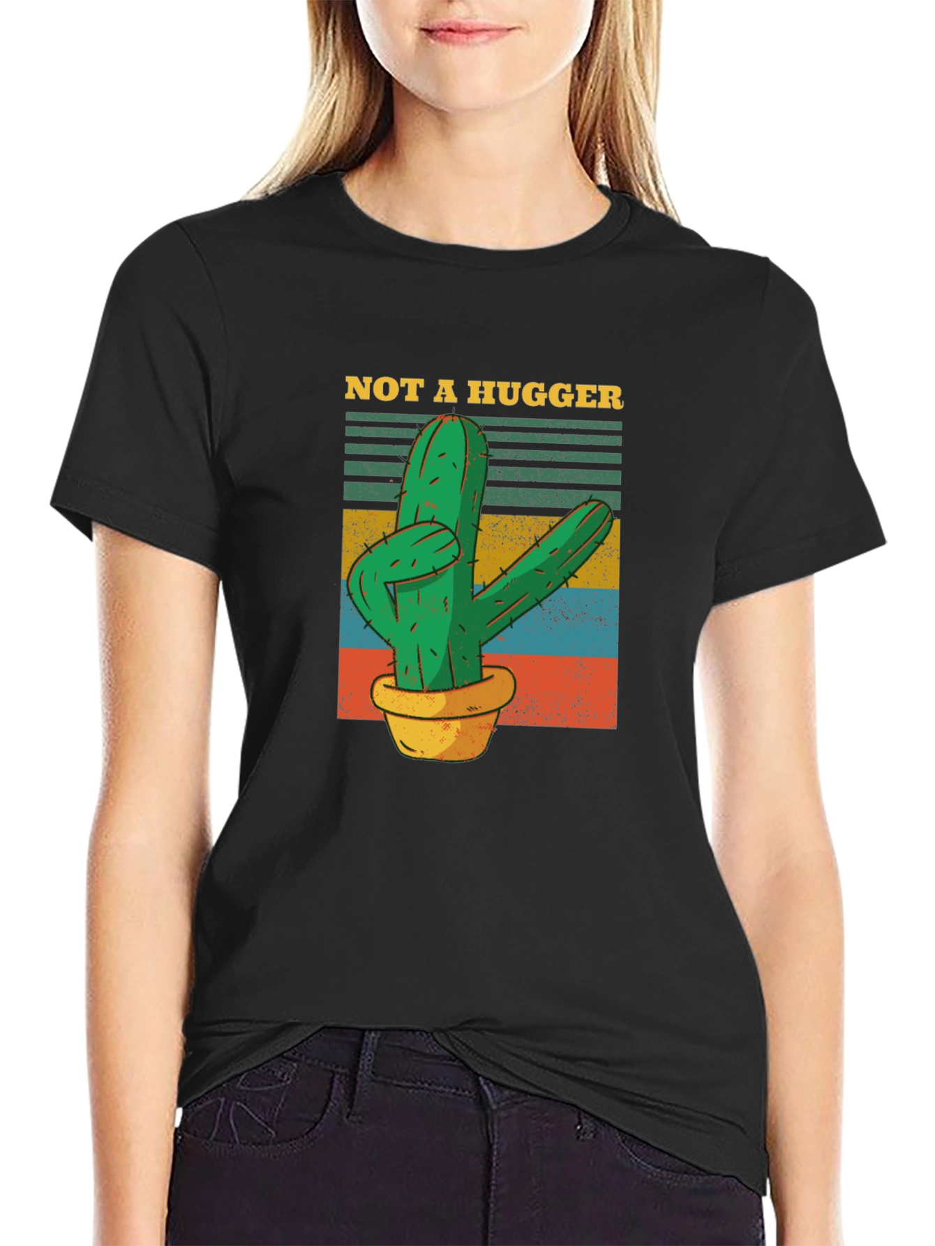 Show off your prickly personality with this unique graphic t-shirt. The shirt features a humorous design with a cartoon cactus giving a peace sign and the phrase "Not A Hugger". The eye-catching graphic is set against a retro-style striped background. This tee is perfect for those who appreciate quirky humor and prefer their personal space. Made from comfortable fabric, this shirt is great for casual outings, lounging at home, or making a statement wherever you go. Pair it with jeans or shorts for a relaxed and stylish look.