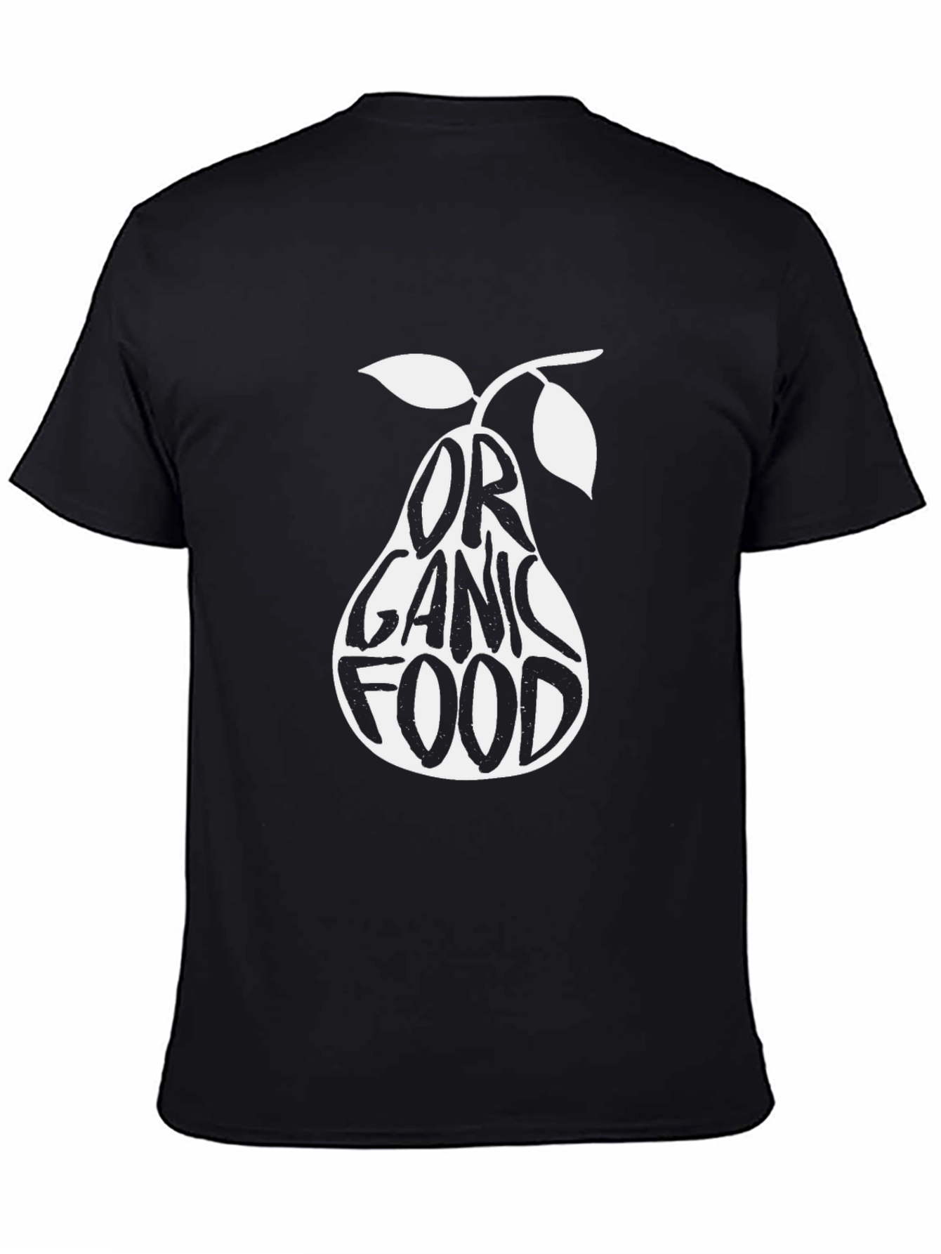 Show your love for healthy eating with this unique organic food t-shirt. The shirt features a stylish white graphic of a pear, artistically filled with the words 'Organic Food'. Made from what appears to be a soft and comfortable cotton blend, this classic black tee is perfect for everyday wear. The design is simple yet eye-catching, making it a great conversation starter for those passionate about organic produce and a healthy lifestyle. Wear it to the farmer's market, a casual brunch, or while relaxing at home. This cool t-shirt is an ideal addition to any wardrobe.