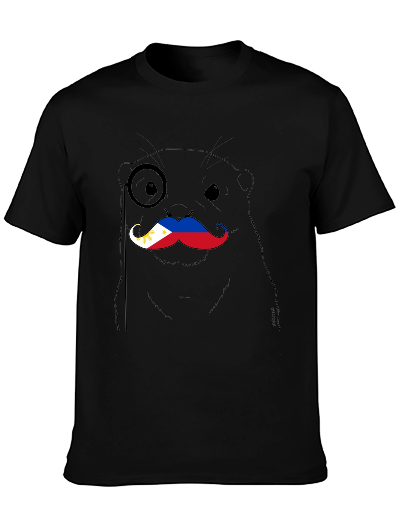 This unique black t-shirt features a charming otter graphic, complete with a monocle and a stylized mustache in the colors of the Philippines flag. Made from a comfortable-looking fabric, this shirt is perfect for casual wear and expressing your love for animals and Filipino culture. The design is eye-catching and quirky, making it a great conversation starter. Wear it to a casual gathering, a cultural event, or simply as a fun everyday piece. Its simple color and unique design make it easy to pair with various outfits. Show off your unique style with this fun and fashionable t-shirt!