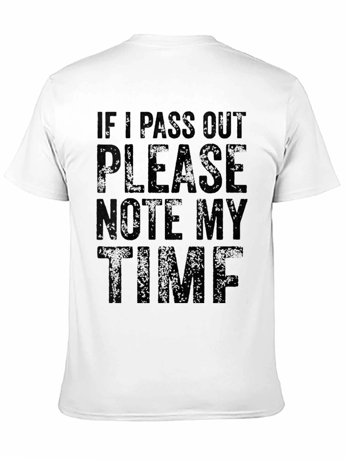 This black t-shirt features a humorous graphic print, "If I Pass Out Please Note My Time". The classic fit and short sleeves make it a comfortable choice for casual wear. The bold text adds a touch of wit to any outfit. It is a great conversation starter, ideal for workouts, parties, or just lounging around. This shirt is perfect for anyone with a sense of humor or who appreciates a funny design. It is a versatile and stylish addition to your wardrobe, sure to get some laughs and turn heads.