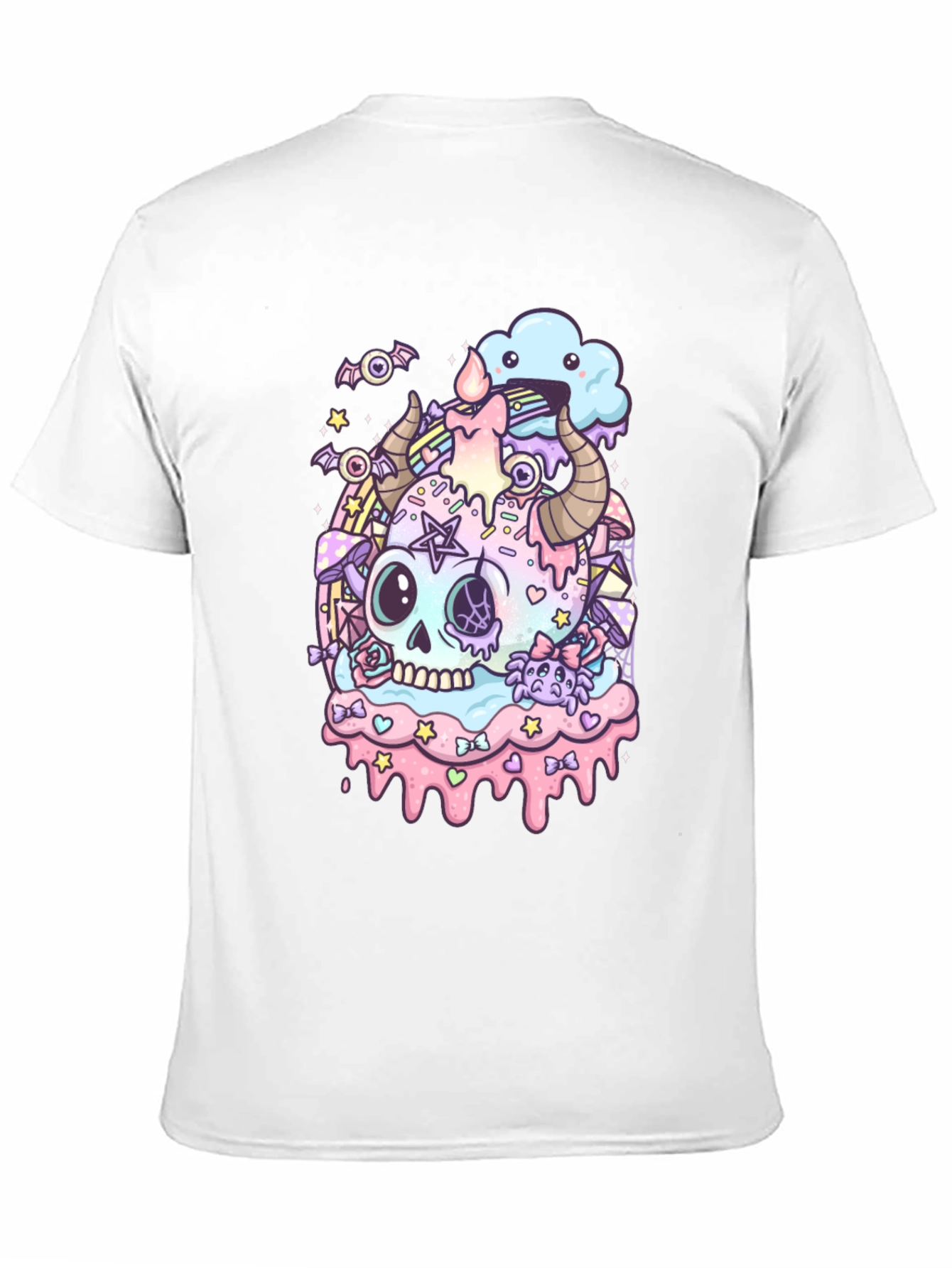 Embrace your dark yet sweet side with this unique black t-shirt featuring a captivating pastel goth design. A skull adorned with horns, a melting candle, and topped with a cloud and rainbow creates a whimsical yet edgy aesthetic. The design incorporates elements of candy, bows, and other cute motifs, perfect for expressing individuality. Made from a comfortable, breathable fabric, this tee is ideal for casual wear, concerts, or expressing your unique style. It's a standout piece for those who love alternative fashion with a touch of kawaii.