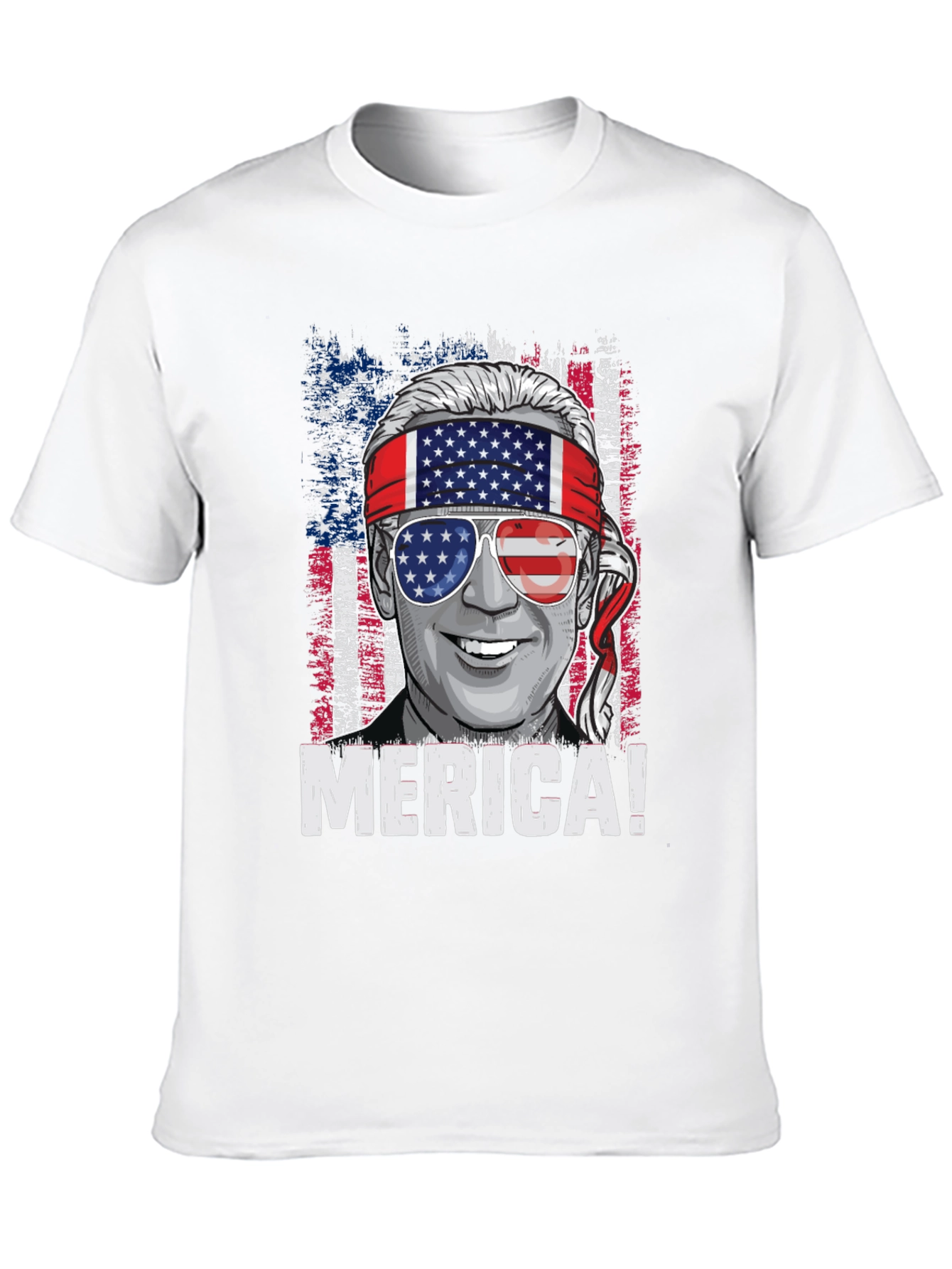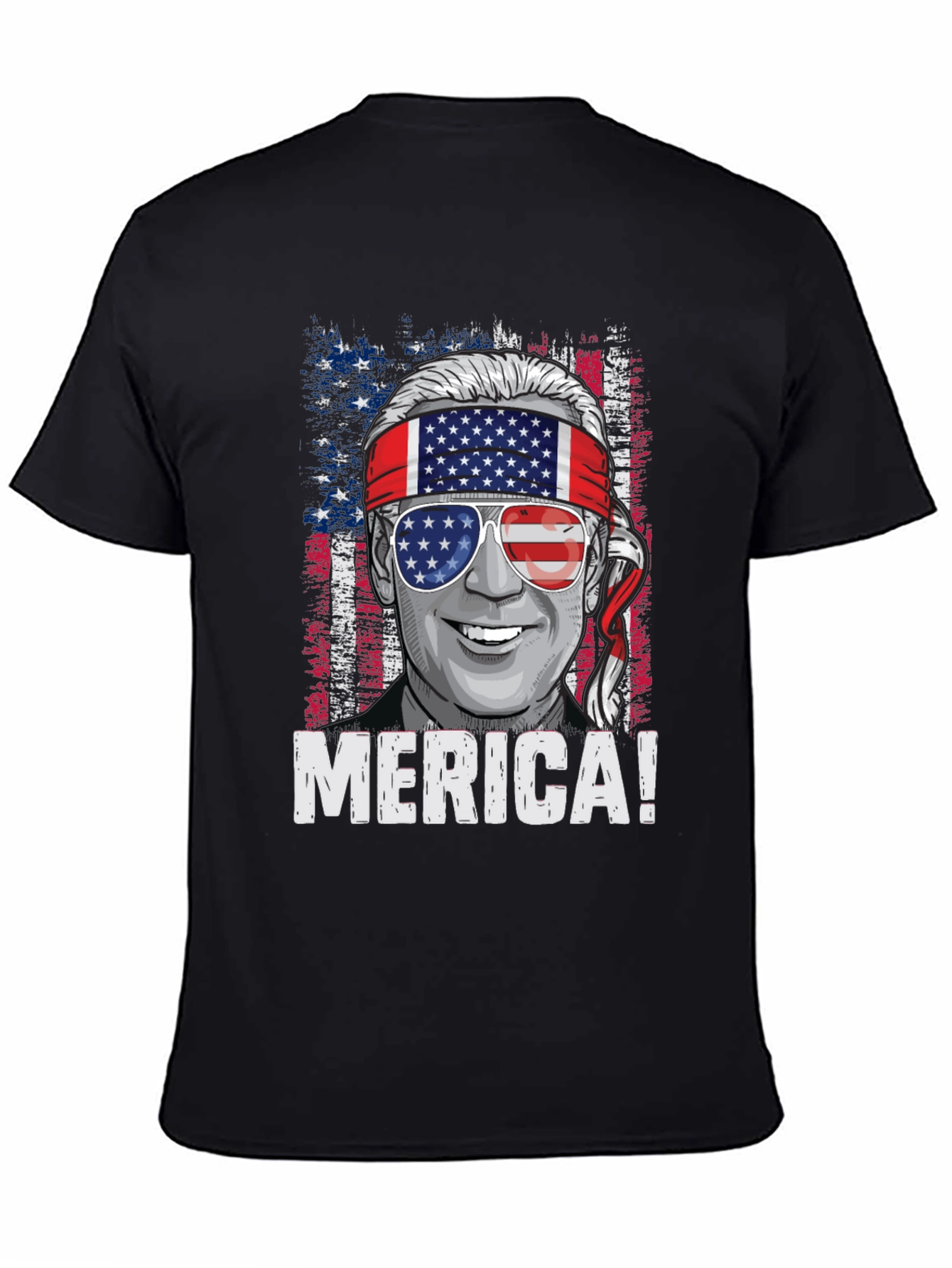 Show off your American pride with this unique graphic tee. The black t-shirt features a striking design of a character with American flag-themed sunglasses and a headband against a distressed flag backdrop. Boldly printed with 'MERICA!' it makes a statement. Perfect for casual wear, patriotic holidays, or expressing your love for the USA. Comfortable and eye-catching, this t-shirt is sure to turn heads and spark conversations. Great for everyday wear, July 4th celebrations, or as a gift for the patriot in your life.