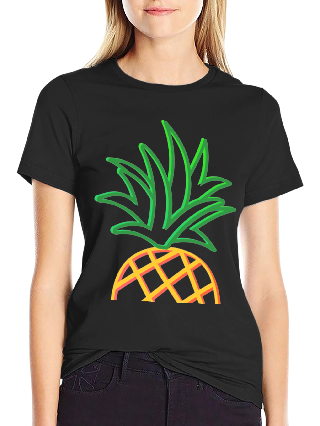 Stand out in this stylish black t-shirt featuring a bold pineapple graphic. The design showcases vibrant green leaves atop a yellow and orange crisscross patterned fruit. Made from a comfortable-looking fabric, this tee is perfect for casual outings, vacations, or simply expressing your fun and tropical side. Pair it with jeans, shorts, or a skirt for a relaxed, everyday look. This unique design is sure to turn heads and add a pop of personality to your wardrobe. Enjoy both comfort and style with this eye-catching pineapple t-shirt.