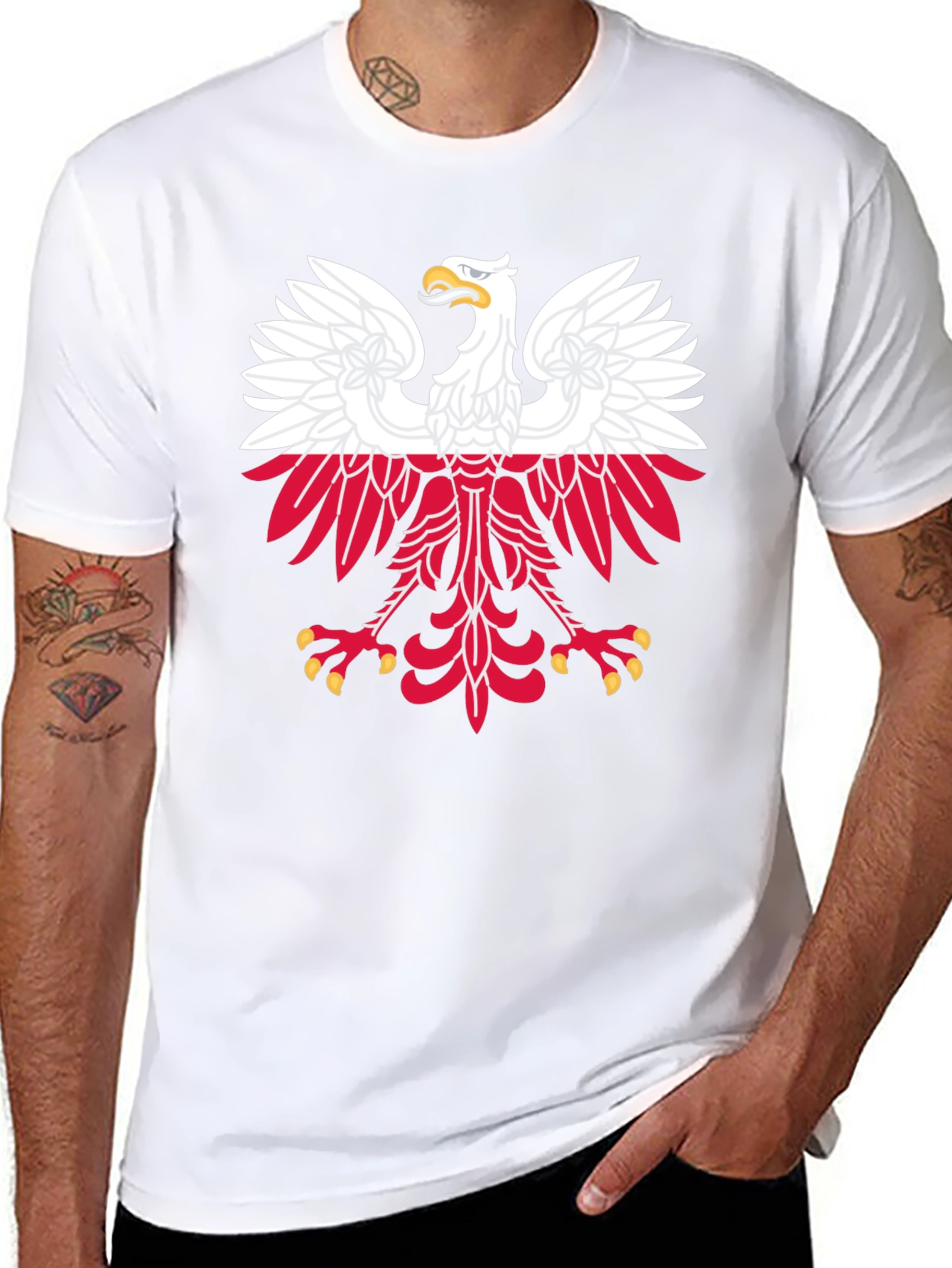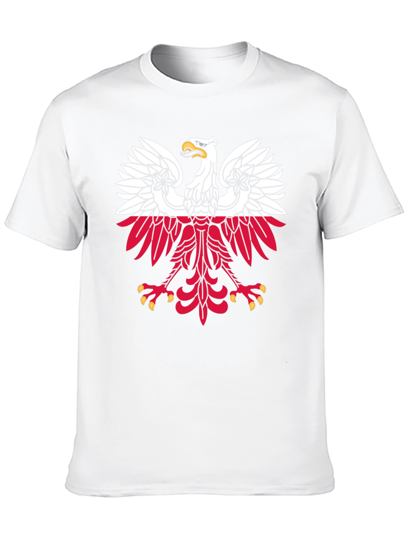 Show your Polish pride with this striking black t-shirt featuring a bold graphic of the Polish eagle crest. The design showcases the iconic white eagle with red accents, instantly recognizable and full of national symbolism. Made from a comfortable fabric, this tee is perfect for everyday wear. Its classic fit suits any style, making it a versatile addition to your wardrobe. Ideal for casual outings, sporting events, or simply displaying your heritage, this t-shirt is a must-have for anyone with a connection to Poland. Express your identity with this eye-catching and meaningful piece of apparel.