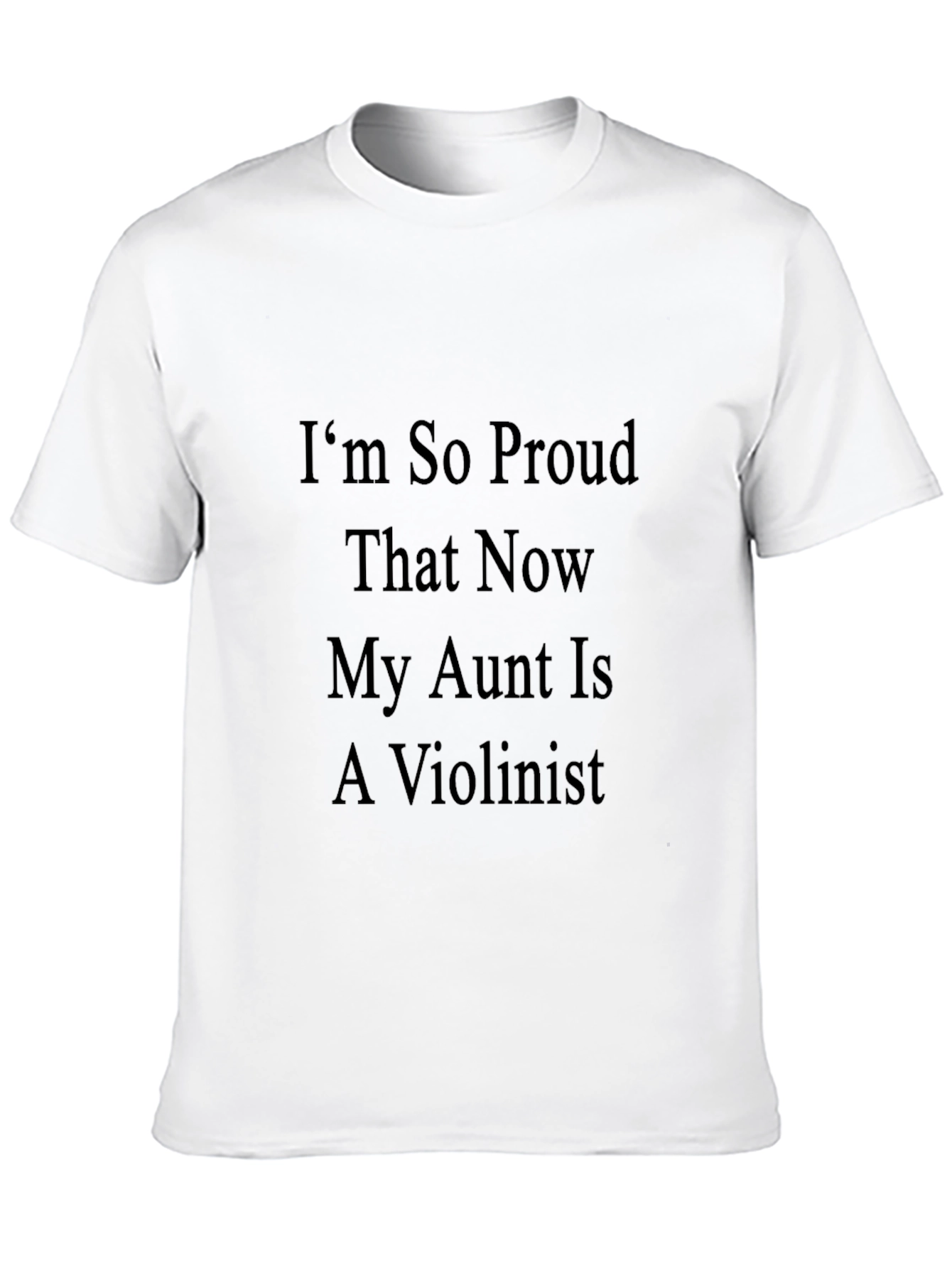 Show your love and support with this black t-shirt featuring the message "I'm So Proud That Now My Aunt Is A Violinist"! This classic fit tee is made from a soft, comfortable fabric, ensuring all-day wearability. The design is simple yet eye-catching, making it perfect for casual outings, family gatherings, or musical events. Wear it with pride and let everyone know how much you admire your talented aunt. A great gift idea for nieces and nephews who want to celebrate their musical family member.