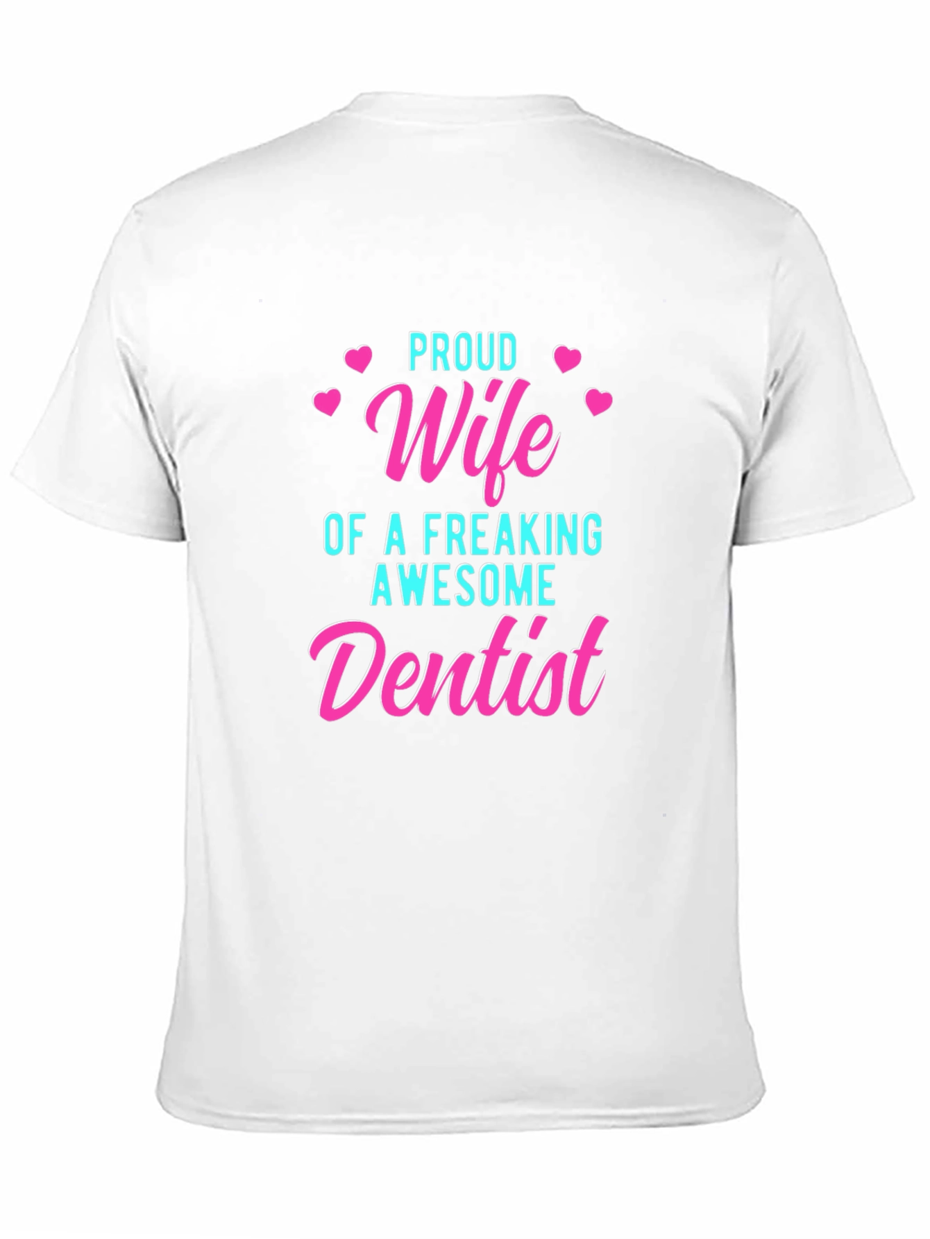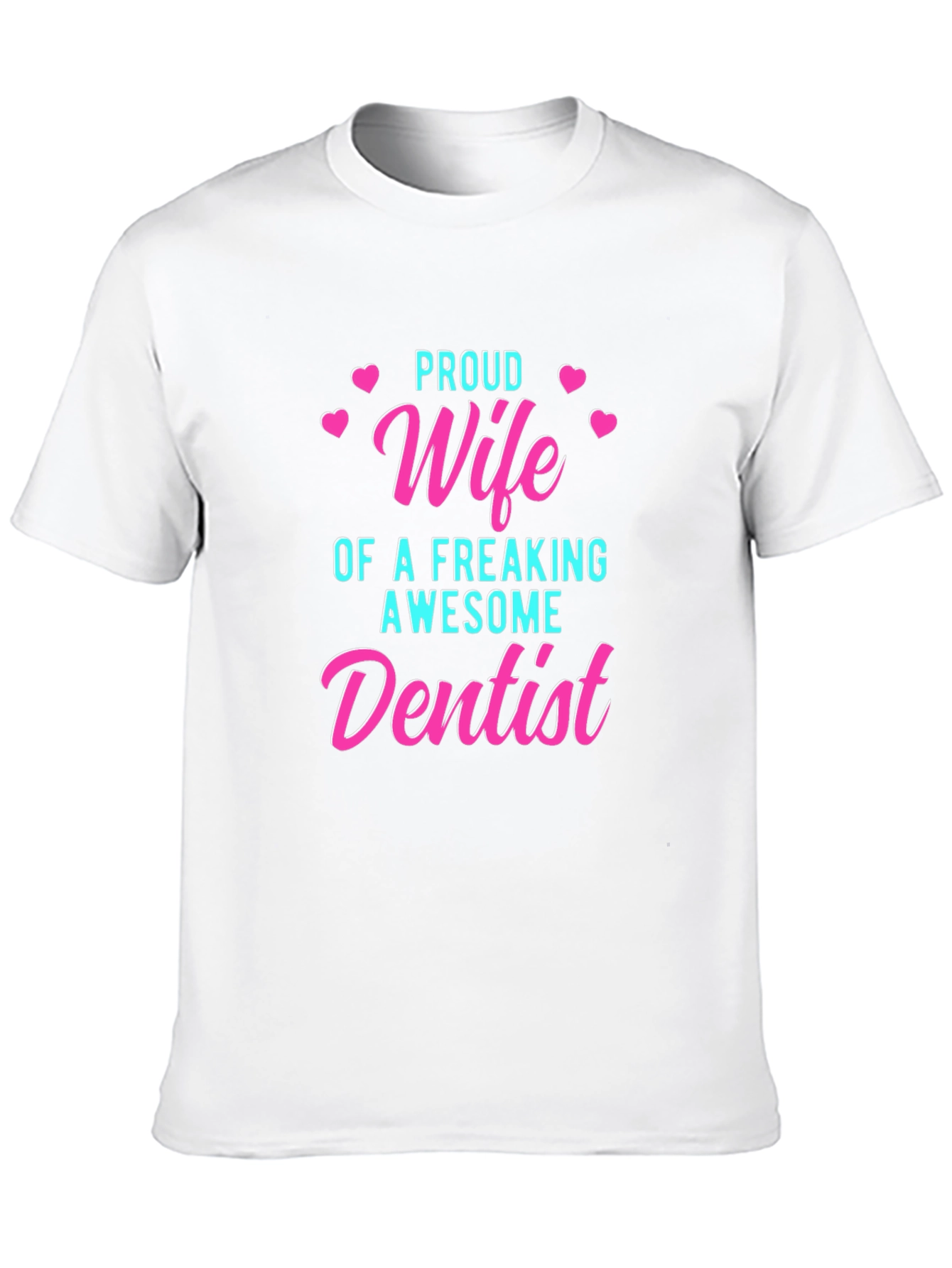 Show your support for your significant other with this black t-shirt. The tee features a playful design with the words "Proud Wife of a Freaking Awesome Dentist" in a mix of aqua and pink fonts. Hearts are added to the design as decoration. This top is made from a soft, breathable fabric. It’s an ideal gift for a dentist's wife who wants to show pride in her husband's profession. The tee is a stylish and comfortable way to express your love and admiration.
