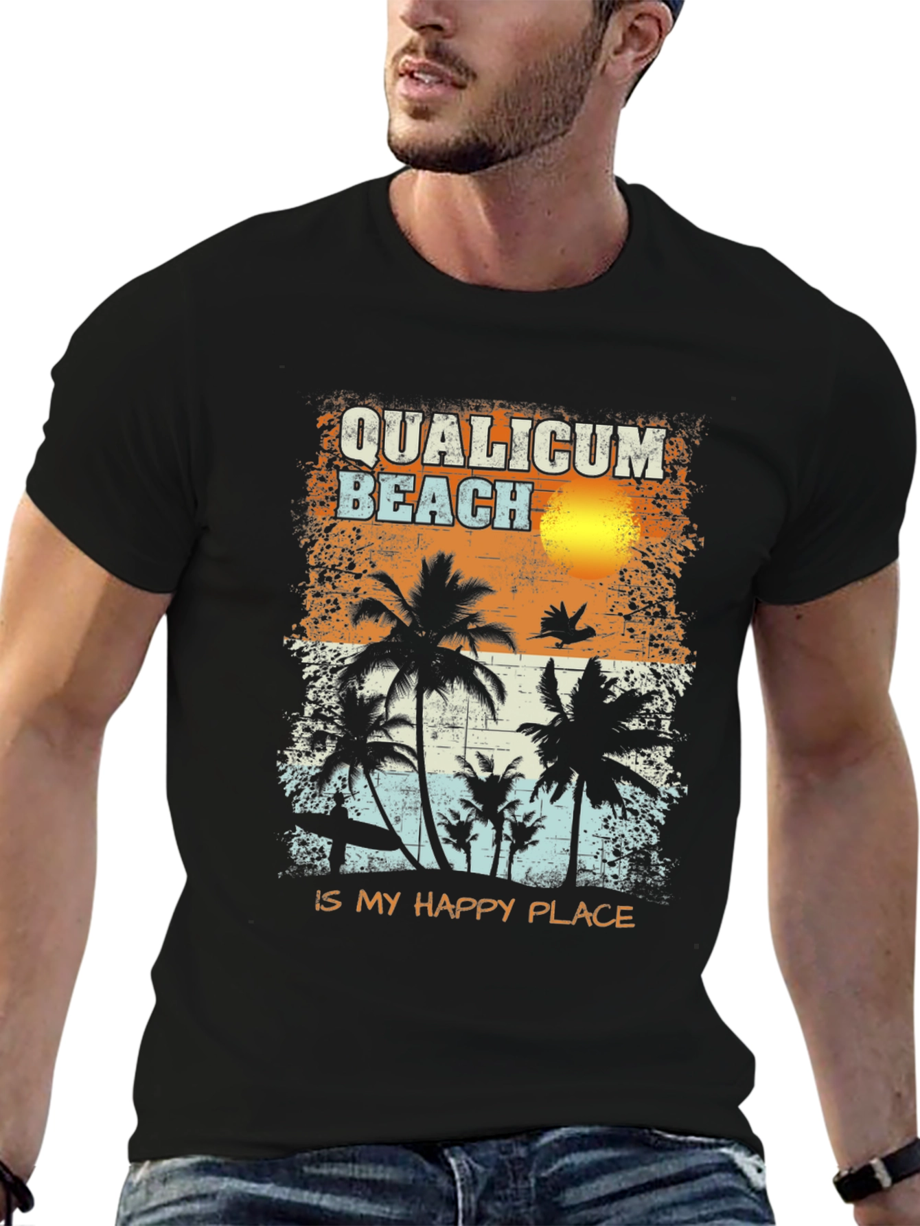 Embrace the island vibes with this unique Qualicum Beach t-shirt! Made from a comfortable, breathable fabric, this black tee features a vibrant, retro-inspired design showcasing a tropical beach scene with palm trees, a surfboard, and a setting sun. "Qualicum Beach" is boldly displayed above the graphic, while "is my happy place" completes the design. Perfect for casual wear, beach outings, or as a souvenir, this t-shirt lets you showcase your love for Qualicum Beach in style. Add this eye-catching piece to your wardrobe and transport yourself to paradise every time you wear it!