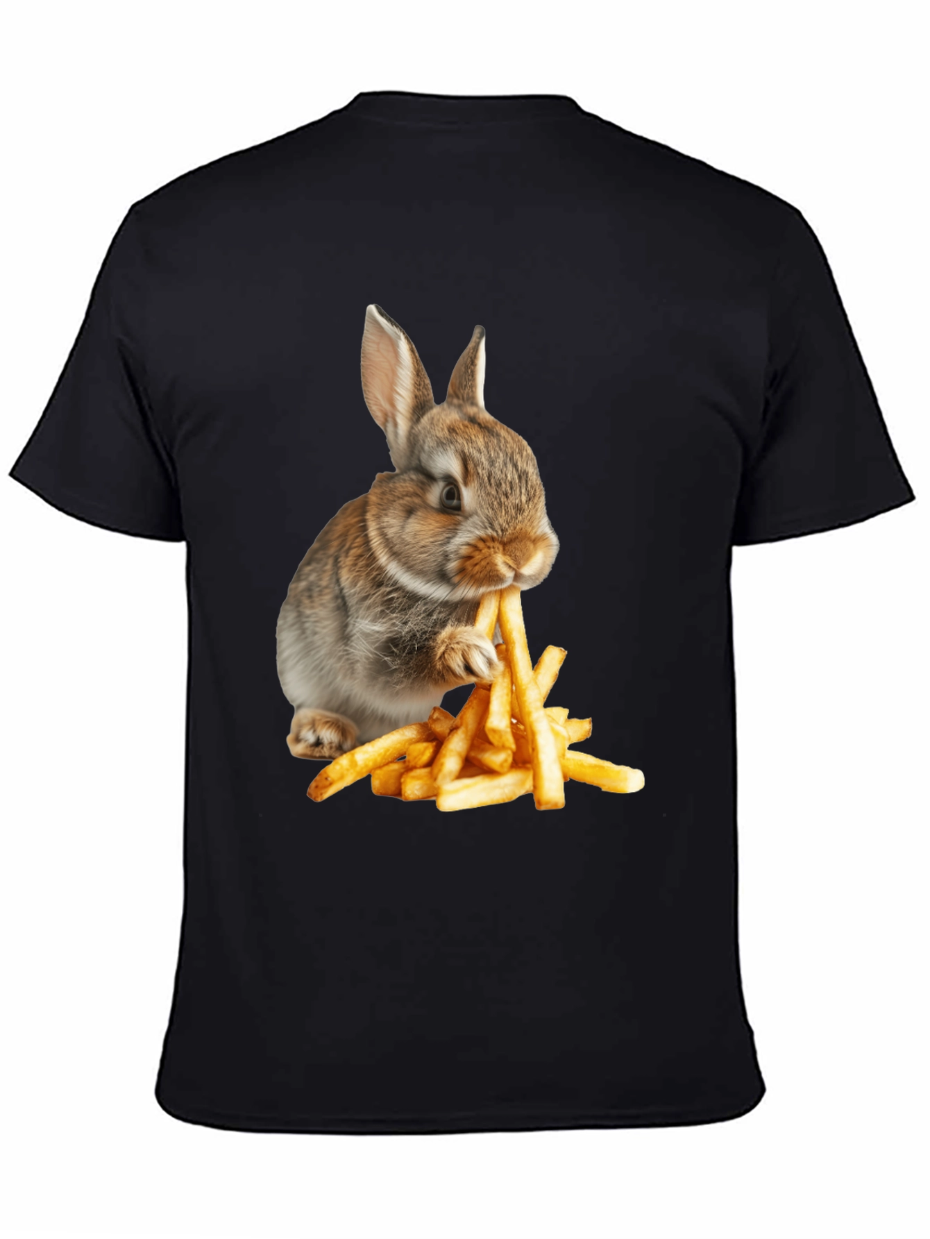 This black T-shirt features a playful and eye-catching design of a cute rabbit enjoying a pile of golden french fries. The high-quality graphic print makes it a standout piece. Made from a comfortable, soft-touch fabric, this T-shirt is perfect for casual wear, whether you're hanging out with friends, running errands, or just relaxing at home. The classic crew neck and short sleeves ensure a comfortable fit for all-day wear. Ideal for animal lovers or anyone with a fun sense of style, this T-shirt is a great addition to any wardrobe. Show off your unique personality with this fun and quirky tee.