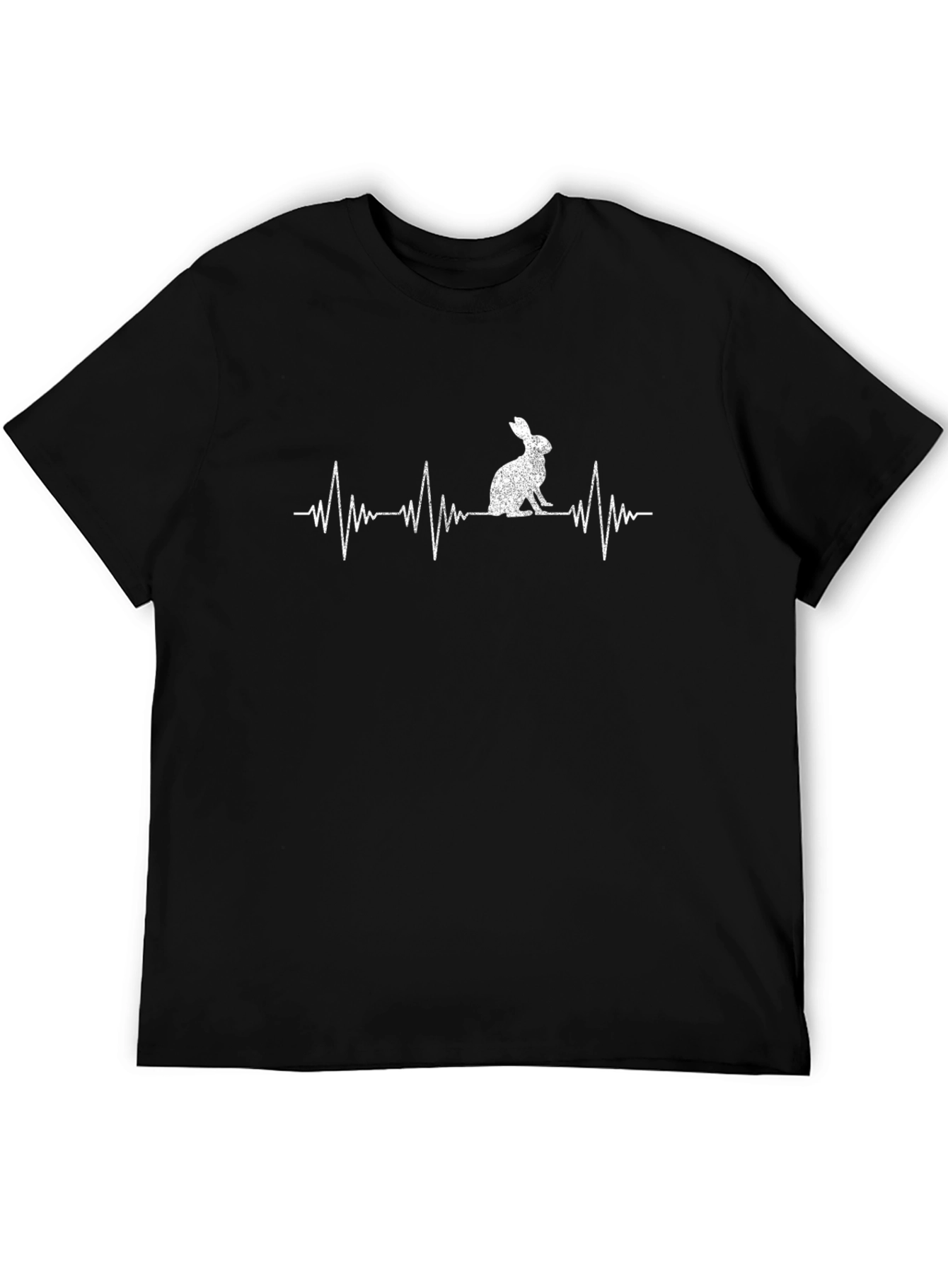 This black t-shirt features a unique and eye-catching design. A white heartbeat line runs horizontally across the chest, with a rabbit silhouette incorporated into the design. Made from a soft and comfortable fabric, this tee is perfect for casual wear. The classic crew neck and short sleeves offer a relaxed fit. Show off your love for animals and stand out from the crowd. Great for everyday wear, animal lovers, or a unique gift. The cool design is sure to spark conversations and add a touch of personality to any outfit.