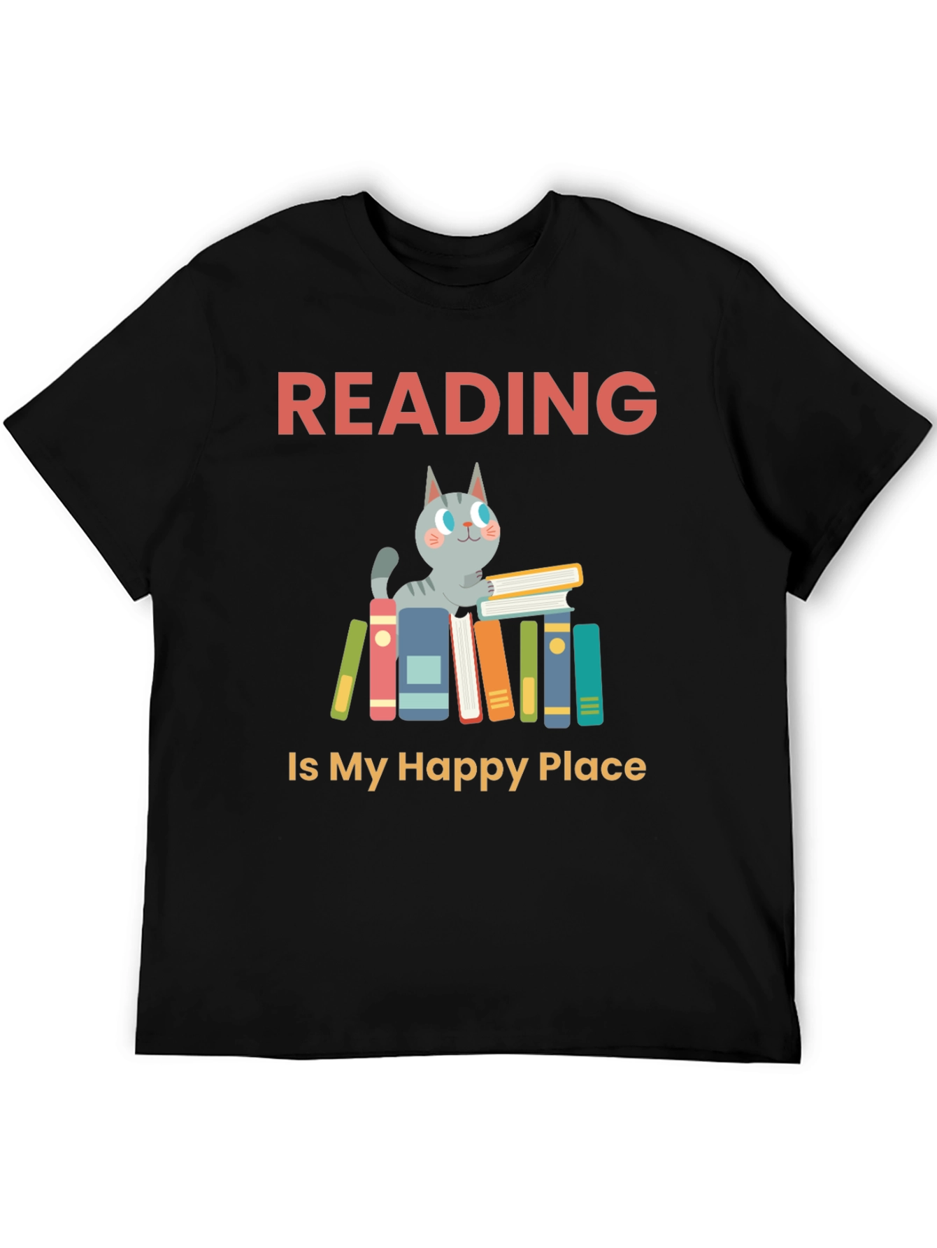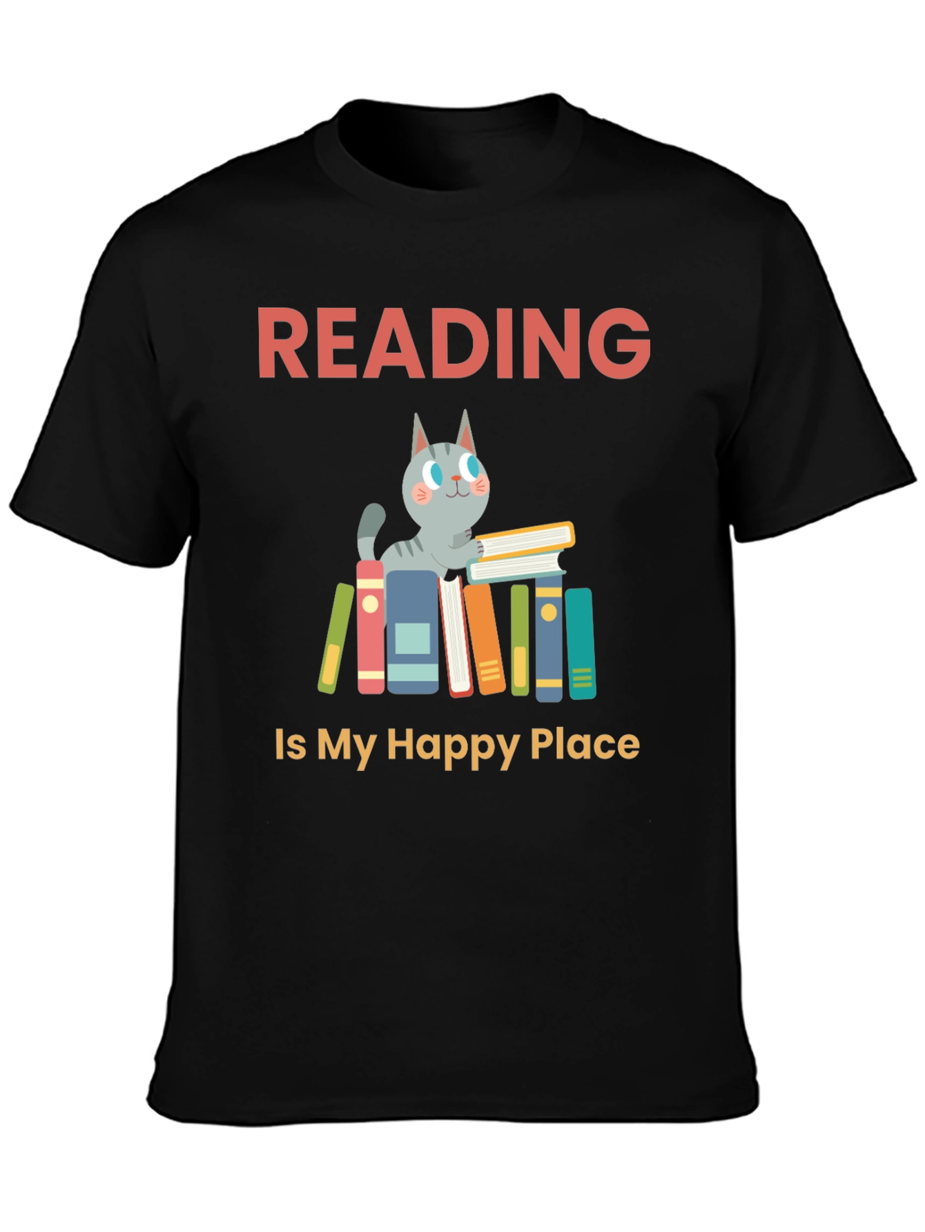 This comfy black t-shirt features a delightful graphic perfect for book lovers. The design showcases the phrase "Reading Is My Happy Place" alongside an adorable gray cartoon cat perched on a stack of colorful books. Made from a soft, breathable fabric, this tee is ideal for casual wear, book club meetings, or lounging at home with your favorite novel. Show off your love for reading with this charming and stylish t-shirt. It also makes a thoughtful gift for the avid reader in your life.