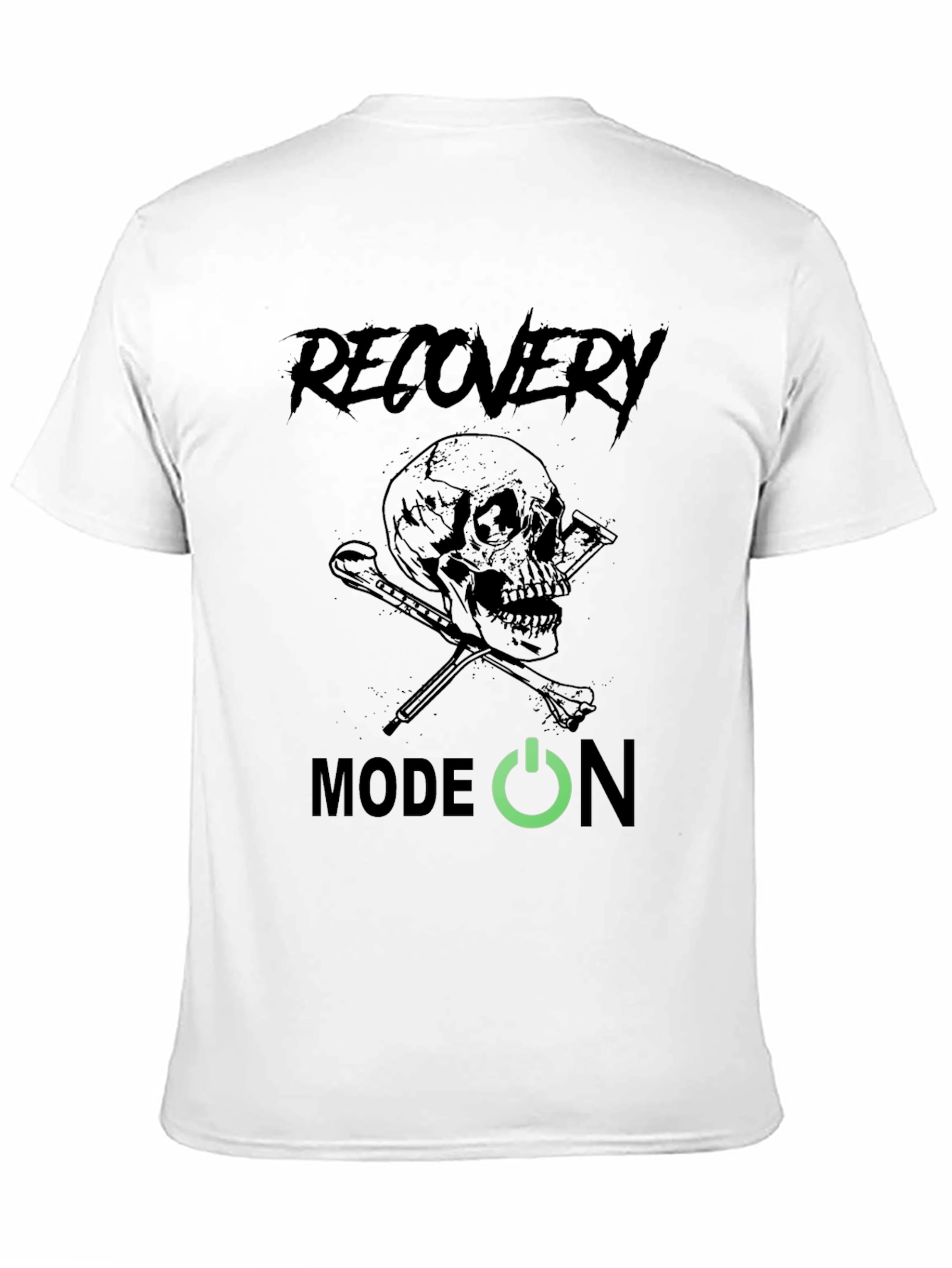 Show off your resilient side with this unique black graphic t-shirt! Featuring a bold skull and crossbones design paired with the phrase "Recovery Mode ON" above a green power symbol, this tee makes a statement. Made from soft, comfortable fabric, it's perfect for casual wear, gym sessions, or anyone celebrating overcoming challenges. The distinctive graphic adds an edgy touch to any outfit. Ideal for gifting or treating yourself, this t-shirt is sure to become a wardrobe favorite. Grab yours and wear your strength!