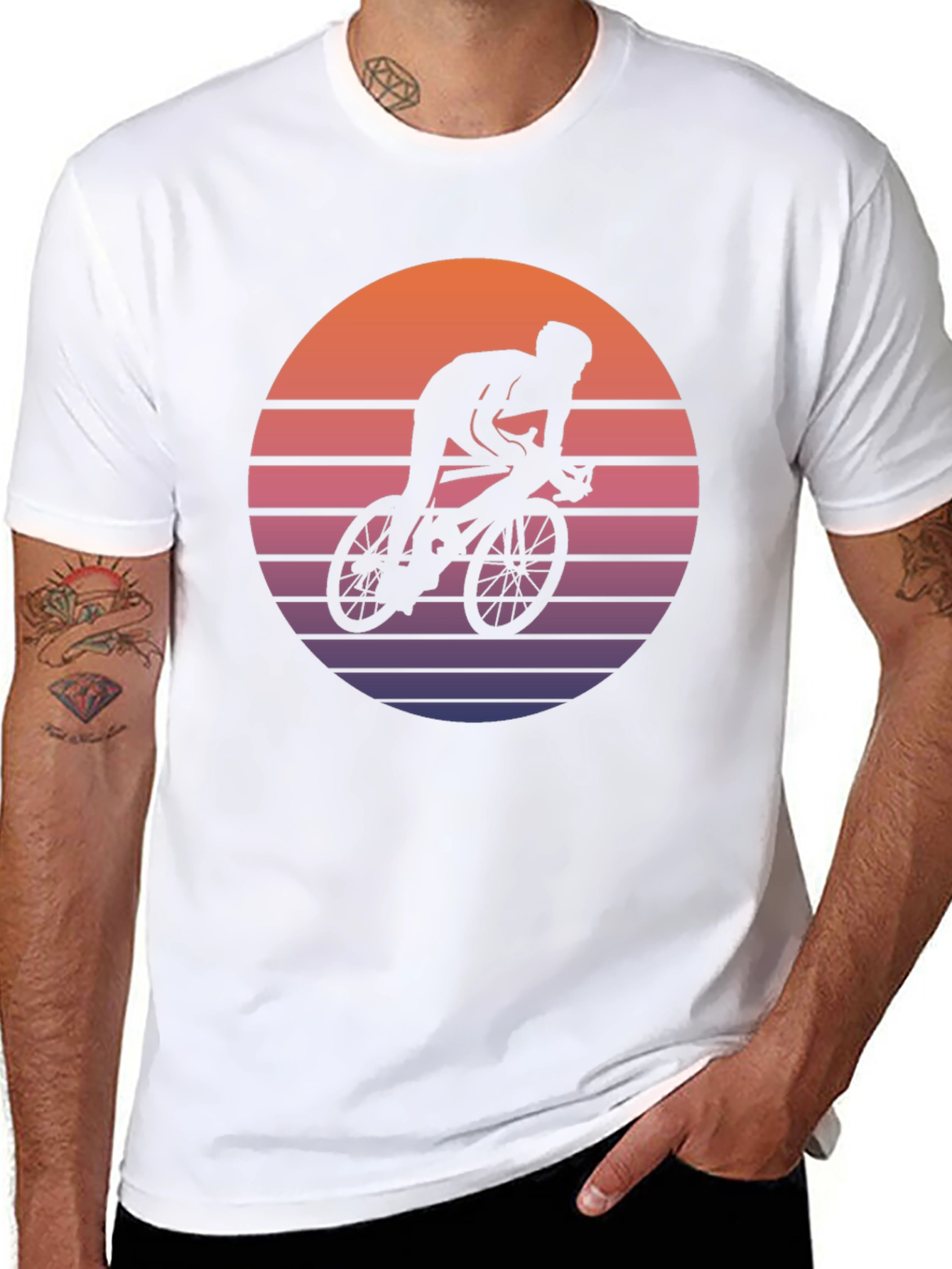 Showcase your passion for cycling with this eye-catching graphic tee. Featuring a silhouette of a cyclist against a retro-style sunset, this shirt is a stylish way to express your love for the sport. The design incorporates orange, pink, and purple horizontal stripes creating a classic vintage feel. Made from comfortable, breathable fabric, this t-shirt is perfect for everyday wear or for layering during cooler months. The shirt's classic fit ensures a relaxed and flattering look for both men and women. Whether you're hitting the road, running errands, or relaxing at home, this cycling tee is a must-have for any cycling enthusiast's wardrobe.