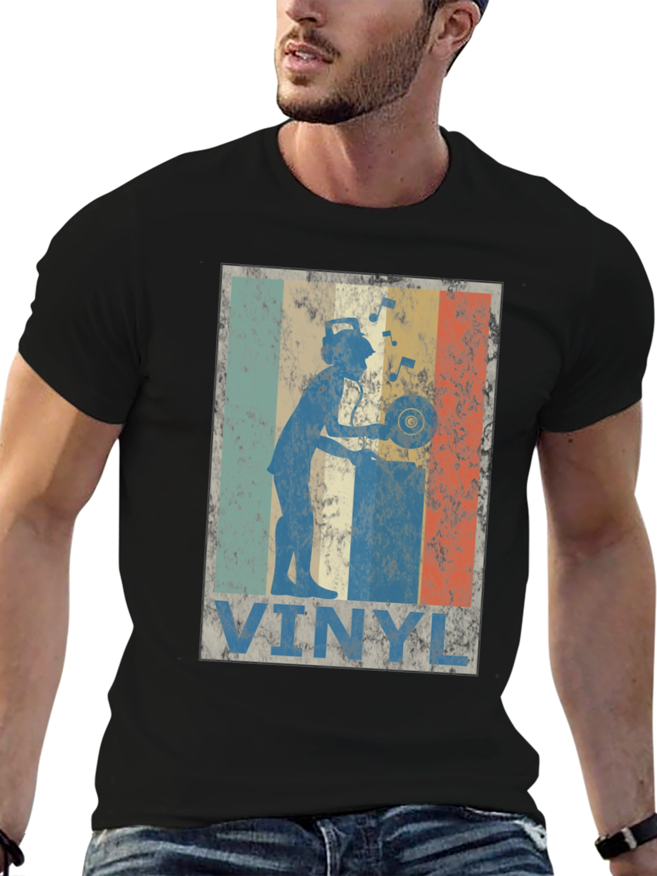 This stylish black t-shirt features a vintage-inspired graphic print of a DJ playing vinyl records. The retro design incorporates distressed textures and faded color bands, giving it a cool, classic look. The graphic depicts a person with headphones at a turntable, accompanied by music notes and the word "VINYL" printed below. Made from a comfortable fabric, this tee is perfect for music lovers, DJs, or anyone who appreciates vintage fashion. Ideal for casual wear, concerts, or music events, this unique t-shirt is sure to make a statement.