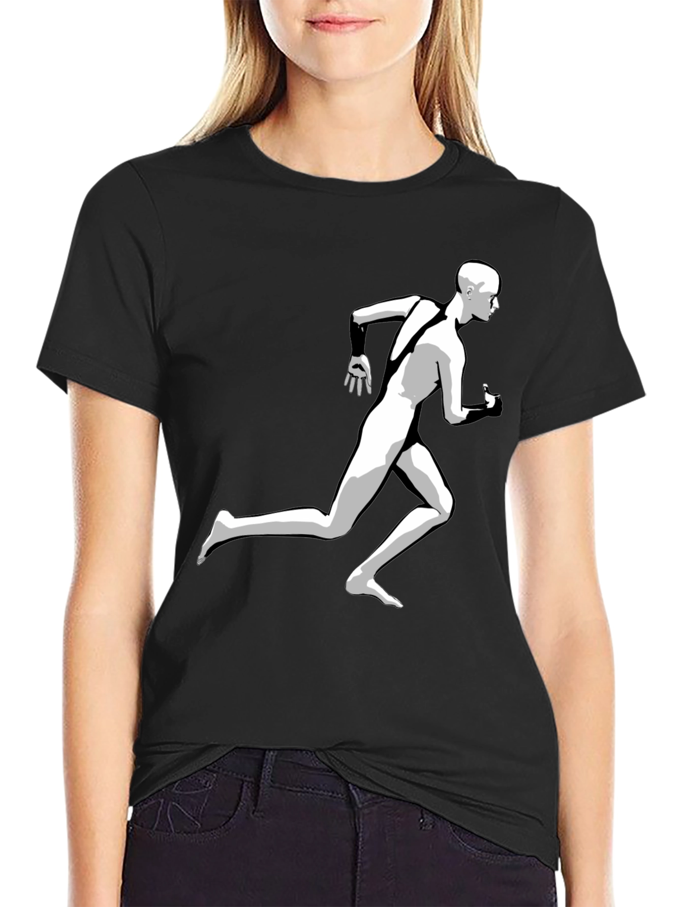 Show off your athletic side with this stylish black t-shirt featuring a unique running man graphic. The design is a white silhouette of a runner, making it a modern and eye-catching piece. This comfortable tee appears to be made from soft cotton, ensuring breathability and all-day comfort. Perfect for casual wear, workouts, or as a statement piece for your everyday style. Wear it to the gym, while running errands, or simply relaxing at home. Makes a great gift for athletes and fitness enthusiasts. Get yours today and add a sporty edge to your wardrobe!
