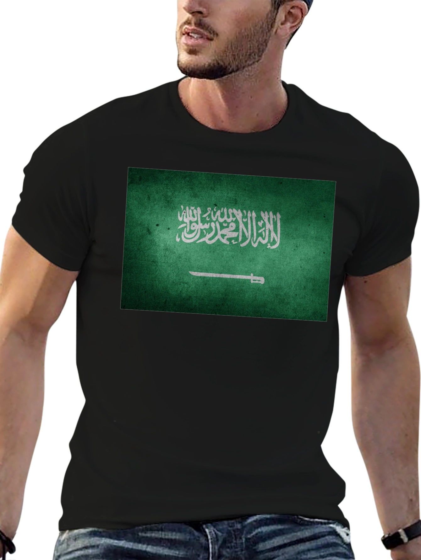 Show your pride with this striking Saudi Arabia flag t-shirt. The design features the iconic green flag with the Shahada and sword, prominently displayed on the front of a classic black crew neck tee. Made from a comfortable and durable fabric, this shirt is perfect for casual wear, cultural events, or as a unique gift for anyone with a connection to Saudi Arabia. The bold graphic print ensures you'll stand out, while the versatile black background makes it easy to pair with any outfit. Wear it with pride and celebrate your heritage.