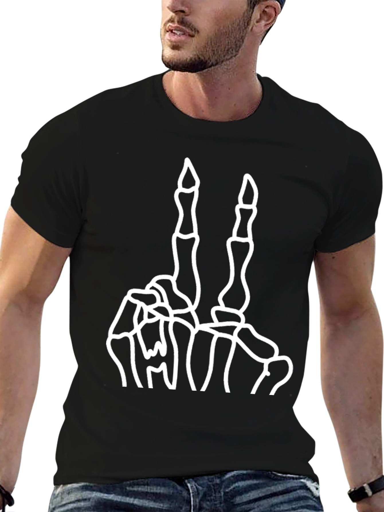Show off your edgy style with this striking black graphic tee. The shirt features a bold, white skeleton hand displaying the peace sign, making it a standout piece. Constructed from what appears to be a comfortable and durable cotton blend, this tee is perfect for casual wear. The design offers a unique twist on a classic symbol, perfect for expressing individuality. Pair it with jeans for a casual look or dress it up with a jacket for a night out. This unique tee makes a great addition to any wardrobe.