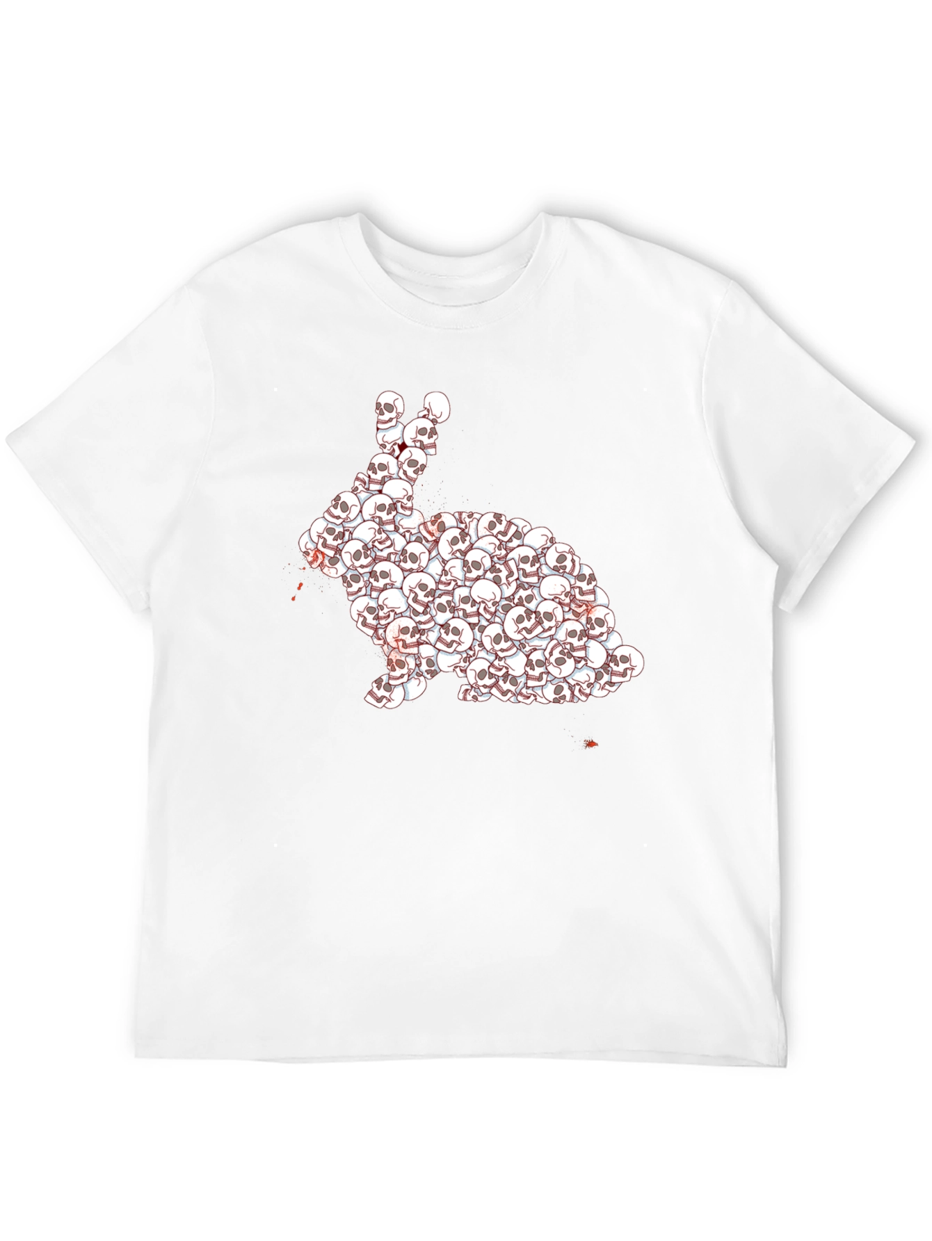 Show off your edgy style with this eye-catching black t-shirt. This unique tee features a bold graphic design of a rabbit, creatively composed of numerous skull illustrations. The design offers a morbid yet artful aesthetic. Crafted from a soft, breathable fabric, this shirt ensures all-day comfort. Its classic fit makes it suitable for various casual occasions. Perfect for those who appreciate dark humor and distinctive fashion statements. Pair with jeans or shorts for an effortlessly cool look. A must-have addition to any wardrobe that embraces alternative style.